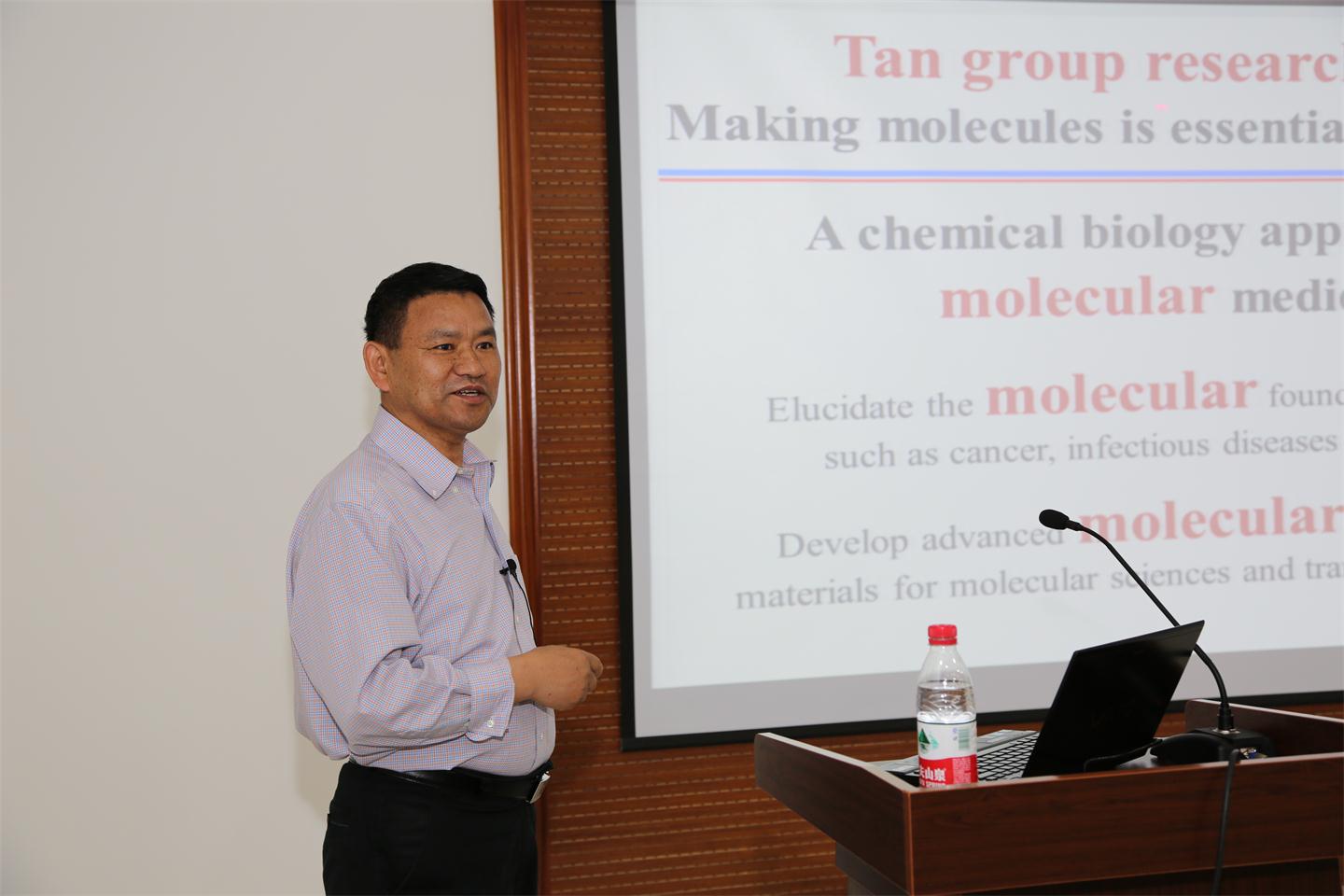 参观结束,谭蔚泓教授做客365英国上市集团官网第117期名师讲坛,为广大师生作了题为“分子医学的基石:化学生物学方法”的学术报告。龙亿涛教授主持学术报告,田禾、朱为宏、叶邦策、花建丽、朱麟勇、解永树、钟新华等教授参加了学术报告会。