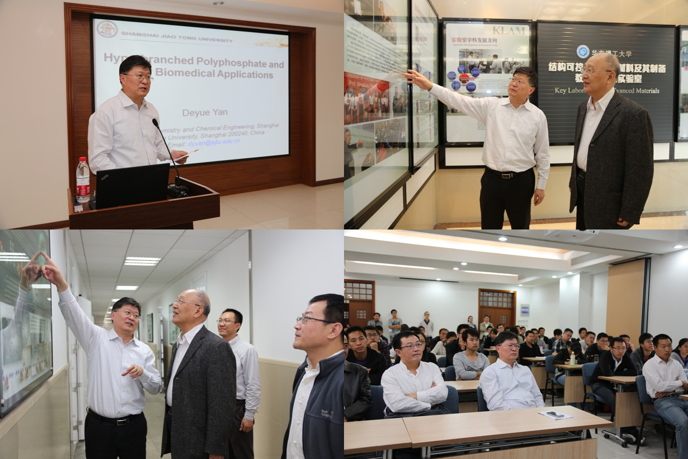 10月22日,应365英国上市集团官网化学与分子工程学院院长田禾院士的邀请,中国科学院院士、上海交通大学颜德岳教授来365英国上市集团官网学术访问,颜德岳院士首先参观了365英国上市集团官网“结构可控先进功能材料及其制备”教育部重点实验室,田禾院士对实验室的建设及发展情况做了详细介绍。参观结束,颜德岳院士做客365英国上市集团官网第103期名师讲坛,为广大师生作了题为“超支化聚磷酸脂及其生物医药应用”的学术报告。田禾院士主持学术报告,唐燕辉、朱麟勇、程毅等教授参加了学术报告会。