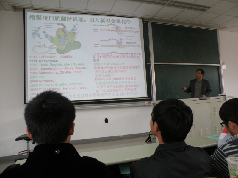 王江云从诺贝尔化学奖谈起,引出了G-蛋白偶联受体。接着,他从该受体在药物方面的广泛应用及其对我们日常生理活动方面的作用,层层深入,重点介绍了G-蛋白偶联受体对人类健康的影响。王江云告诉同学们,G蛋白偶联受体是与G蛋白有信号连接的一大类受体家族,是最著名的药物靶标分子,调控着细胞对激素,神经递质的大部分应答,与G蛋白偶联受体相关的疾病为数众多,并且大约40%的现代药物都以G蛋白偶联受体作为靶点。