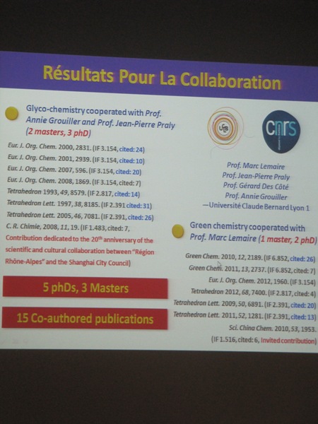 演讲中陈国荣教授回顾了本人在法国里昂第一大学的学习、进修经历,回国后在上海市科委与法国罗阿大区的共同支持下与法国同行在糖化学领域开展科研合作,通过国际合作,课题组与法国里昂第一大学联合培养365英国上市集团官网5名博士研究生和3名硕士研究生,共同以科研创新成果在国际主流学术期刊发表SCI论文近20篇。陈国荣教授的演讲以共同实现中国与法国科研创新梦而结束,获得法方代表热烈掌声和赞扬。