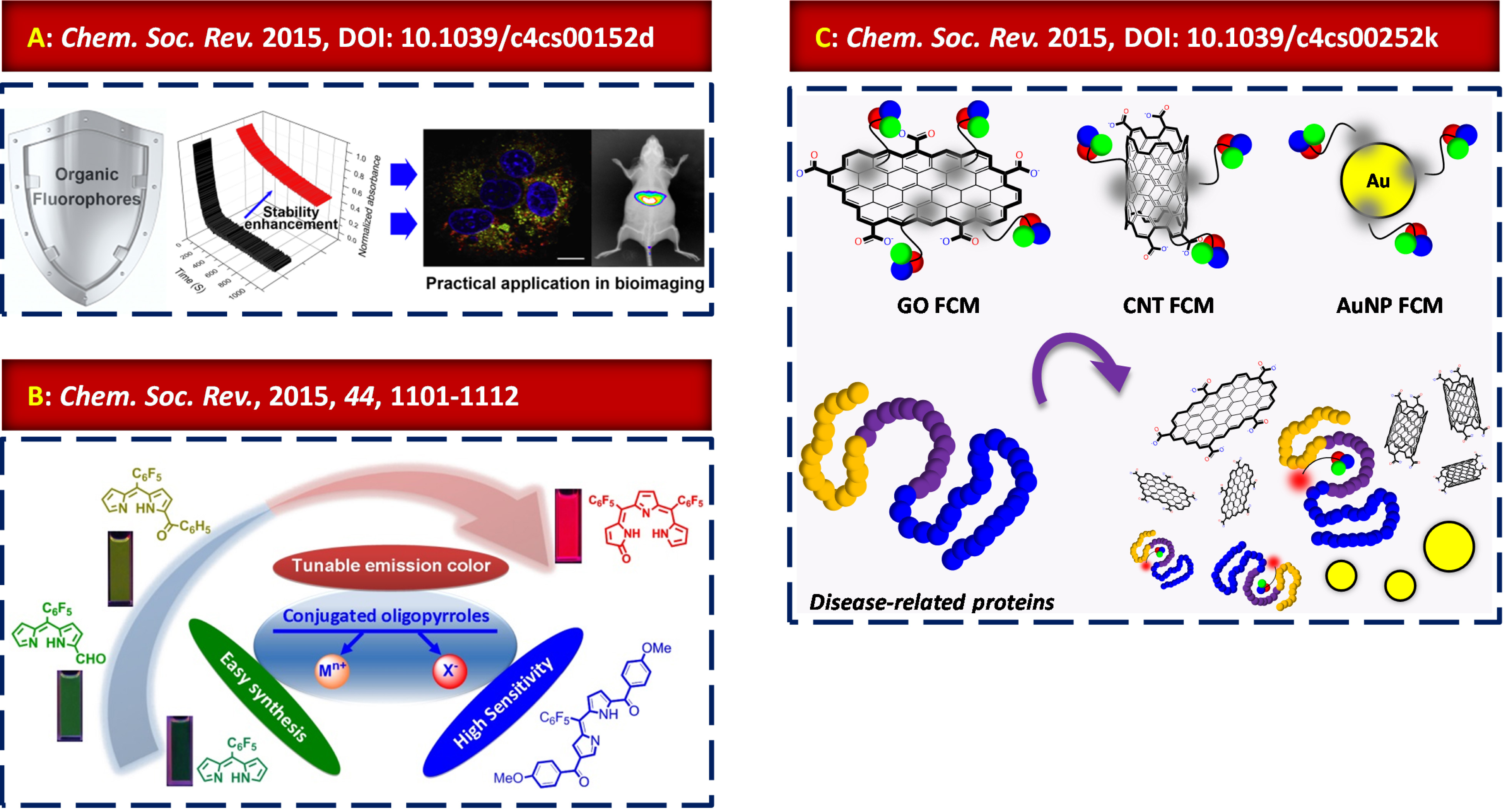 针对传统荧光染料在生物体系内稳定性差这一关键科学问题,朱为宏科研团队与材料学院李永生课题组合作,巧妙应用纳米颗粒包覆与分子工程学构筑等手段,大幅提升了功能染料的光稳定性,拓展了其在癌细胞、活体与血清疾病标志物探测中的应用,先后在JACS (2014)、Chem. Sci. (4篇)、Biomaterials (2013)、Adv. Healthcare Mater. (2012)等发表了系列论文。基于上述系统性科研工作,受Chem. Soc. Rev.邀请撰写题为《Stability enhancement of fluorophores for lighting up practical application in bioimaging》的亮点综述(Highlight,图A,http://pubs.rsc.org/en/content/articlelanding/2015/cs/c4cs00152d#!divAbstract)。