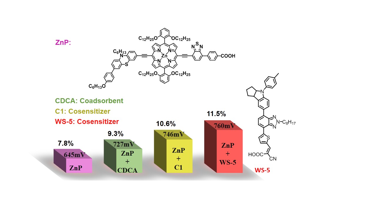 作为传统有机染料,卟啉因其高摩尔吸收系数和突出光电性能而引起了广泛关注,但其在近红外和 500 nm 附近区域存在明显的吸收缺陷。针对该瓶颈,通过对卟啉分子 (ZnP) 给体、受体、桥基及取代基的系统优化,可有效增强其近红外吸收并克服聚集效应,提高光电流和光电压;进一步与纯有机染料 WS-5 等共敏化,最终实现 11.5% 的光电转换效率,取得基于碘电解质的非钌染料敏化电池的最高光电转换效率。该成果为传统碘电解质条件下提高电池效率提供了有效途径。该论文近期发表于《美国化学会志》(JACS, http://pubs.acs.org/doi/abs/10.1021/jacs.5b09665)。