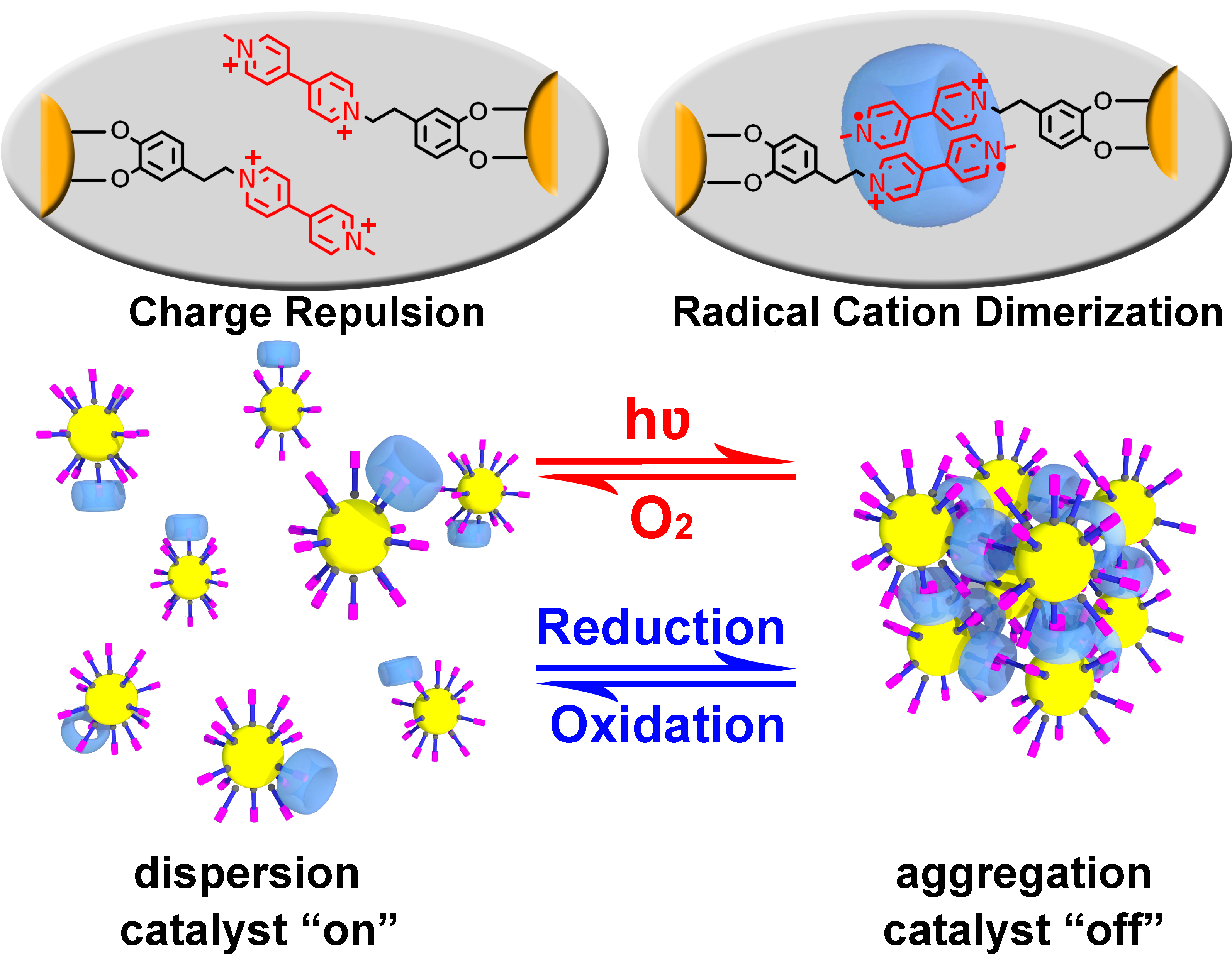 利用超分子化学,特别是主客体化学相互作用来构建刺激响应型智能纳米材料对超分子化学和材料化学领域具有重要意义。基于甲基紫精与葫芦[8]脲之间的氧化还原响应的主客体结构,该工作将甲基紫精双正电荷单元共价修饰到二氧化钛纳米粒子表面,利用二氧化钛的光敏作用产生光生电子,在光照条件下使修饰到二氧化钛纳米粒子表面的甲基紫精双正电荷单元产生单电子还原,产生的甲基紫精正电荷自由基单元与大环主体葫芦[8]脲之间产生1:2主客体络合物。将此类二氧化钛纳米粒子等无机半导体与超分子主客体化学相互作用将结合,赋予了原本只对氧化还原响应的甲基紫精@葫芦[8]脲主客体结构光响应的特性,从而能够实现二氧化钛纳米粒子的光控超分子自组装。同时,该纳米二氧化钛纳米颗粒的可控组装/解组装过程也能实现对二氧化钛光催化活性可逆的“开关”调控,对于构建可转换光催化剂提供了新的理论支持。
