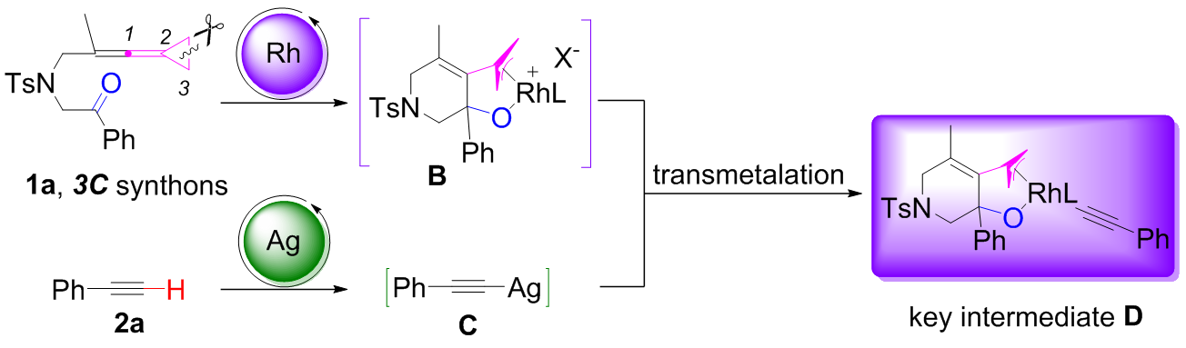 由于直接键连了高活性的联烯基团,亚乙烯基环丙烷(VDCPs)的三元环很容易在加热或光诱导条件下发生近端或者远端的碳-碳键断裂。然而,过渡金属催化下选择性地实现VDCPs三元环发生远端开环的例子却非常少。该研究工作结合双金属协同催化的原理,设计合成了新型羰基取代的亚乙烯基环丙烷类化合物,其在铑催化条件下易快速生成亲电性的烯丙基铑中间体B。同时末端炔烃可在银催化下生成亲核性的炔基银中间体C,通过快速转金属过程,炔烃转移到金属铑上,经过最后的还原消除和质子去金属化过程生成最终产物并解离下催化剂完成催化循环。在生成烯丙基铑中间体B的过程中,络合在金属铑上的手性双膦配体可以对生成产物的立体中心实现完美控制。