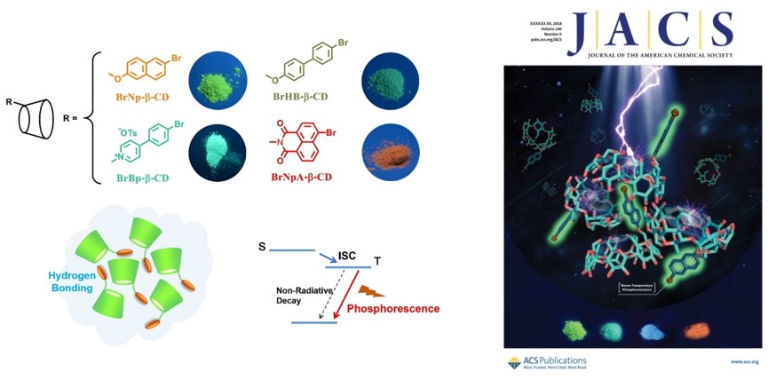 传统的室温磷光材料大多为含贵金属元素的无机或者金属有机配合物,价格昂贵且毒性较大,因此急需发展制备纯有机室温磷光材料来替代。鉴于有机分子的激发三线态能量很容易通过热力学振动与碰撞过程或暴露接触到猝灭因子如氧气而失活,因而纯有机材料很难产生高效的室温磷光发射。目前有机室温磷光体系的构建大多是基于高度有序的晶格或刚性基质包埋材料,其制备过程不便且不易重复,限制了该类材料的发展。该研究工作中,研究团队通过将有机重原子磷光染料基团修饰到β-环糊精上,非常便捷地制备了一系列具有高效室温磷光发射的无定型态有机小分子化合物。这类无定形固态的环糊精衍生物间的氢键环境既能固定磷光团来抑制其非辐射弛豫,也能将磷光团与外界猝灭物质相隔离,从而确保分子能实现高效的室温磷光发射。同时,由于环糊精自身拥有能够选择性地包结芳香化合物的较大疏水空腔,他们还选择利用其中一个环糊精主体衍生物与荧光客体分子利用主客体作用在水中进行预组装来共建超分子体系,制备出具有磷光-荧光共发射且多色发光(包括白光发射)可调控性质的包合物材料。该研究成果首次报道了纯有机小分子无定型态室温磷光材料,制备方法新颖、简单且通用,受到了期刊编辑和审稿人的高度评价(Top 5%),并被选为期刊封面报道。