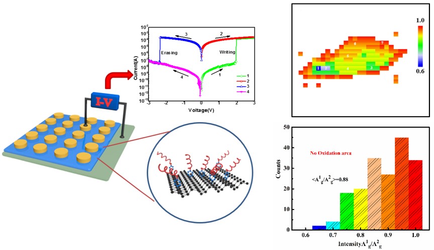 作为后石墨烯时代的代表性新型二维层状材料,少层黑磷(few-layer BP)拥有高的电荷载流子迁移率(〜103 cm2V-1S-1),可调的直接带隙(0.3〜1.5 eV),很强的面内各向异性和宽带非线性光学响应性能。其结构独特、性能优越,在场效应晶体管、信息存储、光调制器、激光防护和Q型开关激光器等光电信息领域具有潜在的重要应用价值。然而,黑磷材料具有极强的空气不稳定性(在大气氛围中易迅速降解)和极差的溶解度,极大地限制了黑磷在光电器件领域的应用。针对这些关键技术难题,课题组通过巧妙的化学修饰方法,用功能性高分子材料对黑磷进行表面共价修饰,在国际上首次成功地制备了基于黑磷的可溶性高分子功能材料PDDF-g-BP。由于高分子的覆盖作用以及高分子共价修饰后对黑磷带隙的成功调节,合成的衍生物材料在大气环境中拥有良好的稳定性,能溶于常见的诸如DMF,NMP等有机溶剂,极大地拓展了黑磷材料的应用范围。作者以此材料为活性层,成功地制备了三明治结构的信息存储器件,该器件在大气环境下表现出了典型的非易失性可重复擦写存储效应,器件开启电压和关闭电压分别为+1.95V 和 -2.34V,电流开关比达到了104。器件在空气中放置3个月之后依旧能够稳定地运行,重现性优良。该项工作的报道为黑磷及其衍生物材料的发展及其在光电领域的应用提供了新的技术思路。