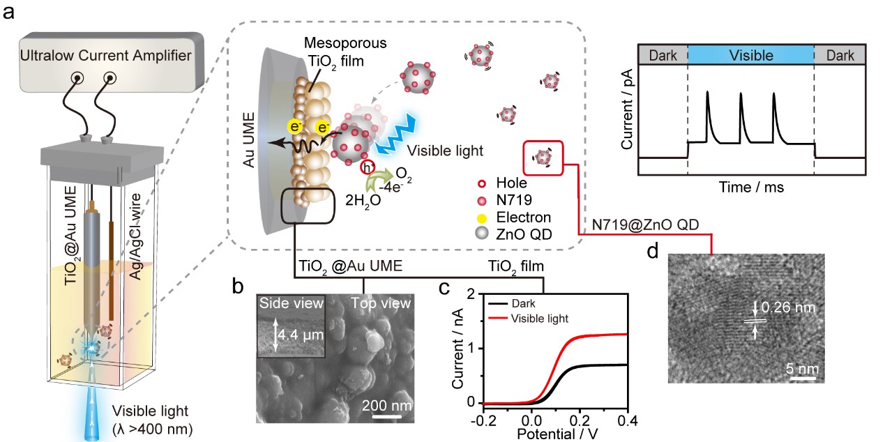 利用染料敏化半导体纳米材料吸收太阳光实现光催化分解水,是目前清洁能源开发的重要途径之一。设计制备高效光催化体系的一个核心问题是:如何定量解析纳米材料和染料分子结构与光催化性能之间的构-效关系。然而,传统分析方法一般只能获得体系中光催化电子转移的整体平均信息,无法对单分子/单纳米颗粒的本征光催化性能进行定量表征。本项研究巧妙地将光催化和单颗粒碰撞电化学结合,构建了超灵敏单颗粒光电化学检测体系。针对超快光致电子转移过程,设计可有效延长电子传递时间的半导体TiO2超微电极,实时监测了染料敏化ZnO单个纳米颗粒光致电子在不同厚度TiO2膜中动态传递过程,实现了单个染料分子水平可见光解水性能的定量评估。在此基础上进一步建立随机游走理论模型,解析了光致电子的复合和传递路径,揭示了电子在TiO2半导体膜内的动态扩散机制。该微纳界面光电检测方法对单分子/单颗粒本征光电化学性能的研究具有重要意义,为进一步研究高效太阳能光电转换体系提供了突破点。