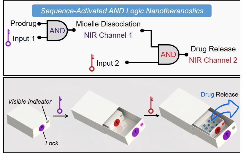 在复杂生物环境中实现精准的可编程诊断和治疗仍然非常具有挑战,特别是消除来自非特异性激活的“假阳性”信号尤为困难。该工作创新性通过共价键将双通道菁染料(Cy)荧光前药连接于超灵敏pH响应聚合物的疏水嵌段,构建具有序列响应的AND型布尔逻辑门,实现了利用近红外双通道荧光实时示踪药物在活体中次序性响应的“解离-释放”过程。该工作利用序列响应AND型逻辑门的设计策略,通过双通道可视化实时示踪前药过程,有效增加了药物的靶向能力和精准释放,显著提高其对肿瘤的治疗效率。