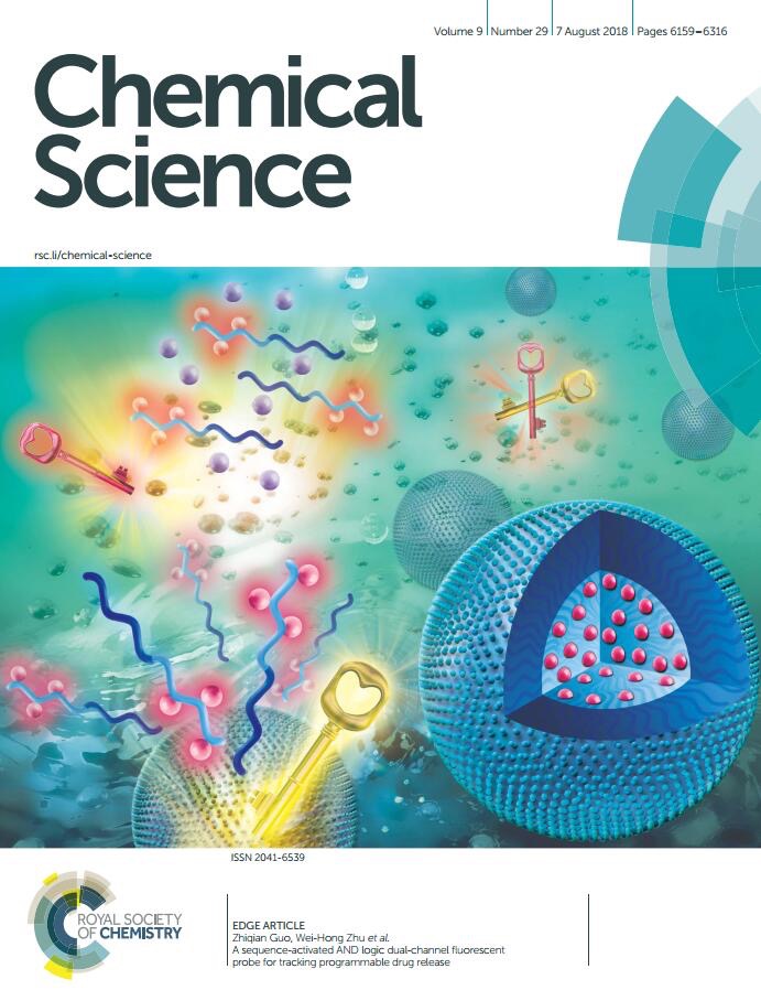 该工作创新性提出基于布尔逻辑运算的双通道近红外智能药物输送系统,其所构建序列响应的AND型逻辑门可以有效避免前药免非特异性激活,只有通过内源性肿瘤标志物的精准激活才会进行药物释放。特别是双通道近红外荧光信号响应实现了对药物释放过程的实时示踪,能有效减少抗癌药物的副作用和实时监测药物何时、何地、如何发挥其治疗效果,这种序列响应的AND型逻辑门为开发精确可编程的药物输送系统和智能生物传感探针提供了新思路。该文章被Chemical Science评选为“2018 Chemical Science HOT Article Collection”、“2018 ChemSci Pick of the Week Collection”以及Chemical Science内封面文章,并被RSC英国皇家化学会“New & events”版块以《Targeting tumours》为题对该文章进行专题评述。