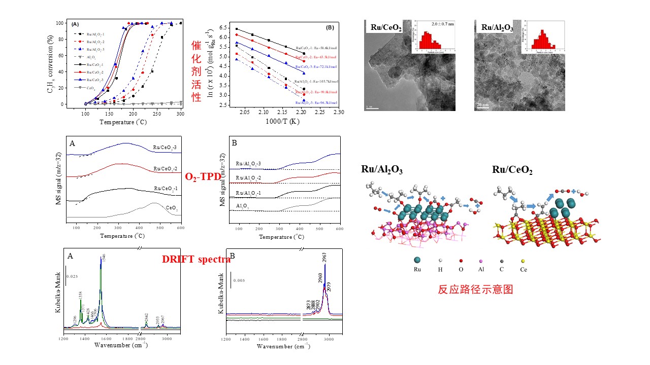 4f电子的高度局域化和表面弛豫决定了稀土元素氧化物CeO2具有特殊的表面电子结构。研究者充分利用其特性,以CeO2为载体,设计和制备了具有低温丙烷燃烧高活性的Ru/CeO2催化剂,其活性要显著优于Al2O3和TiO2等传统载体负载的Ru催化剂,而且也优于商业化的负载型Pt和Pd催化剂,表现出很好的应用前景。通过催化剂的结构和物化性质表征,发现不同载体上负载的Ru纳米颗粒的大小略有差别,而Ru的价态几乎相同,证明Ru活性位的状态与催化剂活性的变化并不存在对应关系。相反,多种表征技术同时证实了CeO2载体自身的特性是造成Ru/CeO2催化剂具有低温丙烷催化燃烧优异性能的关键因素。即丙烷在Ru/CeO2催化剂上发生催化燃烧反应时,CeO2不仅提供了更多的丙烷吸附位,还提供了额外的反应氧来源,使得丙烷在Ru/CeO2催化剂上反应时存在额外的反应途径,从而显著提高了其丙烷燃烧活性。