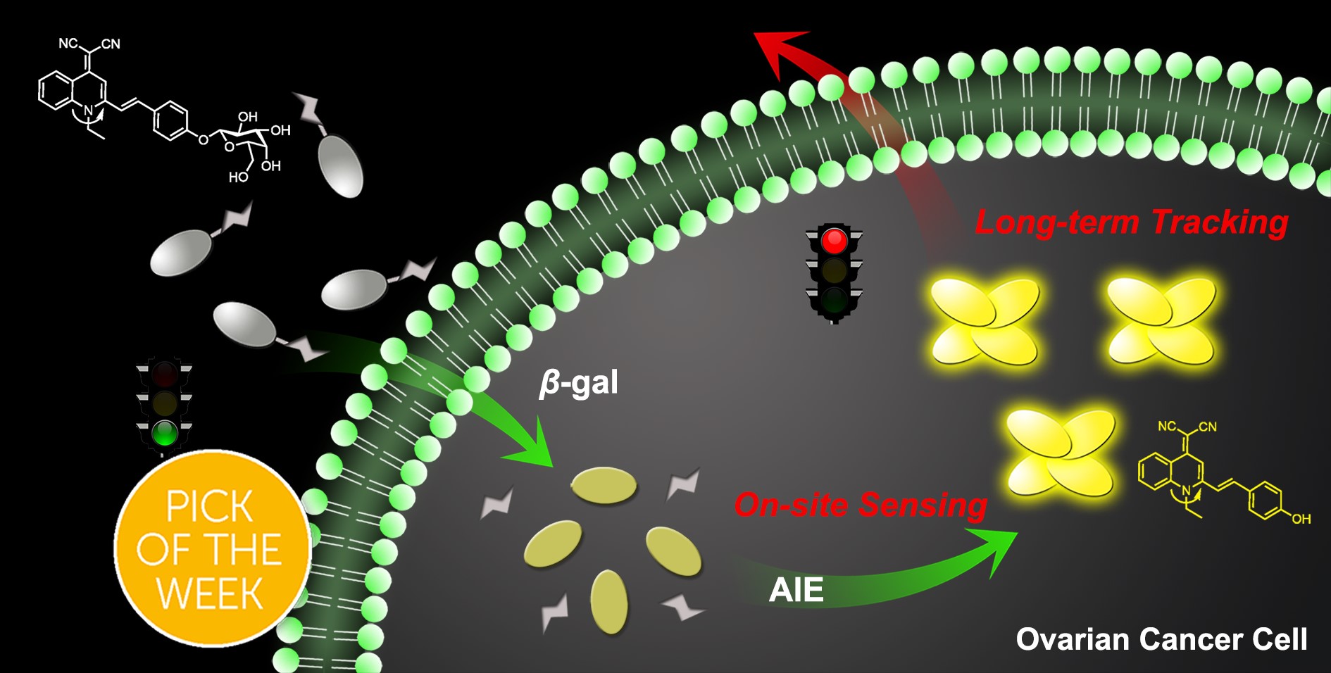 针对小分子荧光探针难以实现原位、长时间实时示踪的挑战,研究人员提出了一种酶调控释放原位生成纳米聚荧光体AIEgens创新策略:利用高效酶催化反应释放出疏水性AIEgens,然后在激活位点原位生成具有荧光信号的AIEgens纳米聚集体;由于纳米聚集体不易被细胞排出,因此具有较好的细胞内滞留能力,能够实现细胞中的活性酶原位检测和长时间示踪。β-半乳糖苷酶作为一种重要的生物标志物,在卵巢癌和细胞衰老方面已经开展了广泛的研究。利用激活AIE型分子探针QM-βgal对内源性β-半乳糖苷酶高表达的卵巢癌细胞(SKOV-3)实现了特异性检测,在活细胞器中观察到显著增强的激活荧光信号;并且当孵育时间延长至12 h后,仍能够对SKOV-3细胞中β-半乳糖苷酶的表达进行原位示踪。该工作不仅为研究酶的生物学功能提供了一种理想的分子工具,而且为发展具有高保真成像功能的探针提供了一种新的策略。相关研究成果以“An enzyme-activatable probe liberating AIEgens: on-site sensing and long-term tracking of β-galactosidase in ovarian cancer cells”为题在线发表于《Chemical Science》杂志上(Chem. Sci. 2018, DOI: 10.1039/c8sc04266g,原文链接:https://pubs.rsc.org/en/content/articlelanding/2018/sc/c8sc04266g#!divAbstract)。