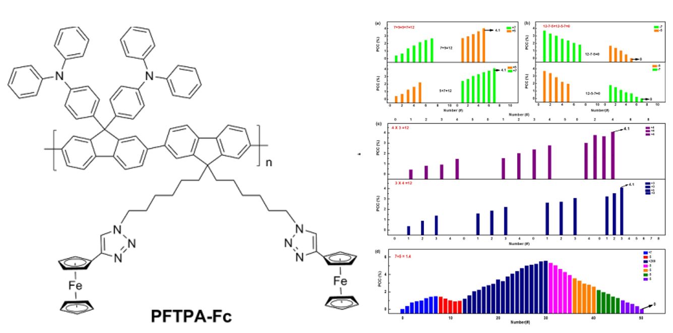 忆阻器(Memristor)是一种具有电阻的结构(电极/介质/电极)和量纲(欧姆)的新型纳米电子器件。当在忆阻器两端施加的电压超过一定数值时,器件电阻可以发生两态、多态甚至连续的可逆变化,从而实现单值甚至多值的信息存储。更为重要的是,利用忆阻器执行可重构的非易失性算数与逻辑操作,在单一器件中原位实现信息存储与运算的融合,更有望突破长久以来限制计算机实际运行速度的冯·诺依曼瓶颈,这对于简化计算机架构并提高其运算性能具有重要的意义。而与传统的无机半导体材料相比,有机聚合物具有优异的机械柔韧性和延展性,并且可以通过印刷和喷墨打印等溶液加工方式实现低成本集成,在面向边缘计算的柔性芯片中具有得天独厚的优势(Yu Chen* et al., Materials Horizons 2014, 1: 489-506,Engineered Science 2018, 4:4-43;Chem. Soc. Rev. 2012, 41: 4688–4707)。陈彧课题组通过Suzuki偶联反应和“点击化学”合成了侧链含三苯胺和二茂铁基团两个氧化还原体系的新型聚芴功能材料(简称为PFTPA-Fc,图1),利用其固态三重氧化还原忆阻行为制备了柔性忆阻器原型器件。电学性能测试表明该器件在低电压下分别呈现8态/3值存储特性和连续的模拟忆阻行为,并可在高电压下实现两种特性的自由切换;而原位荧光光谱与二维成像测试则证实PFTPA-Fc在高、低电压下的忆阻行为分别来自三苯胺和二茂铁基团的可逆固态电化学氧化还原反应。利用该器件的模拟忆阻行为不仅能够执行十进制四则算术运算,还可以完成基本的二元布尔逻辑操作,从而在单一聚合物忆阻器中实现多值信息存储与处理功能的集成,为发展高性能、低功耗的存算一体器件与芯片提供了新的材料体系和理论基础。