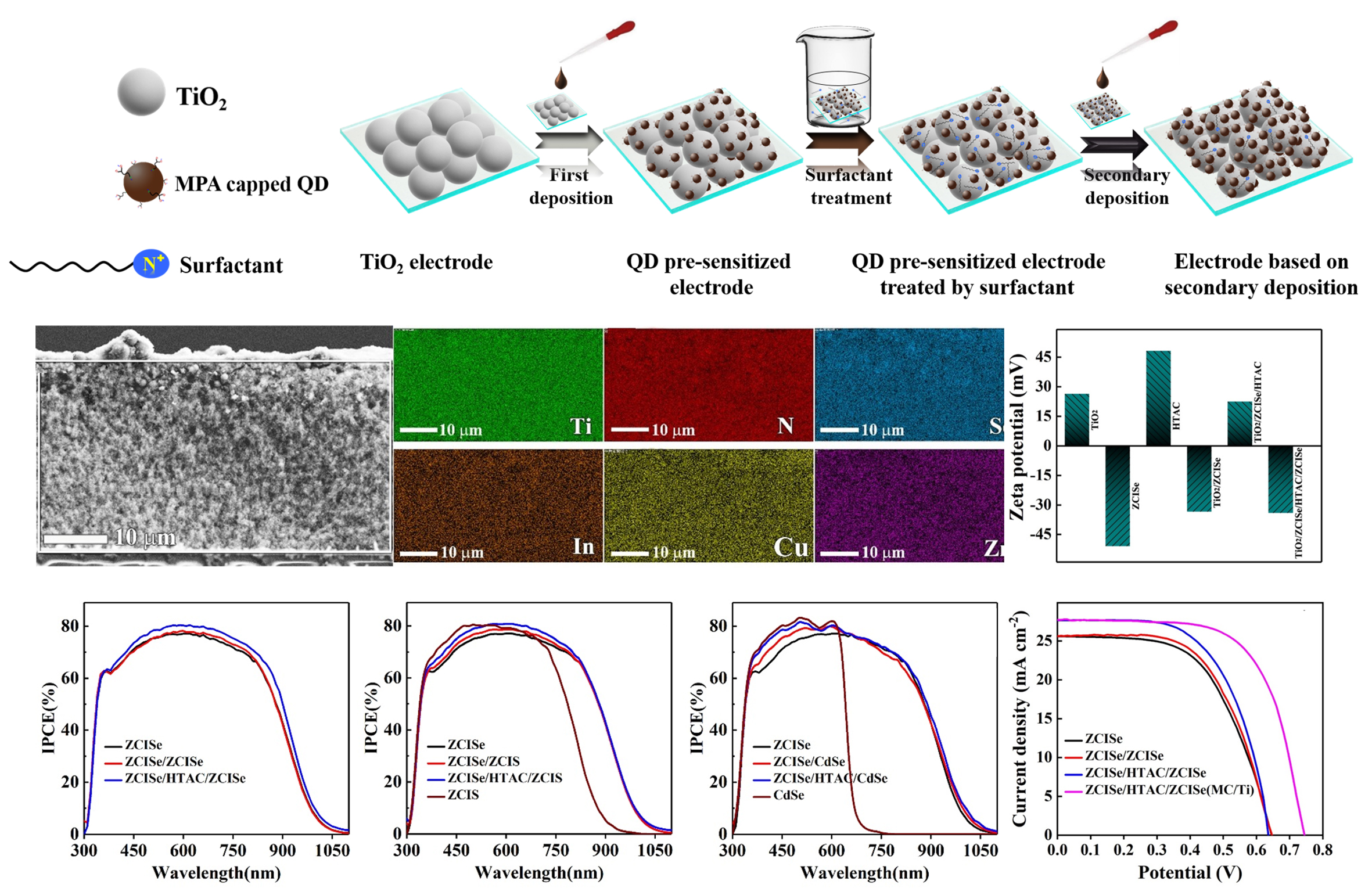 捕获太阳光子是光电转化的第一步,也是最重要的一步。对于量子点敏化太阳能电池(QDSC)来说,提高量子点光捕获剂在介孔二氧化钛膜内的负载量,无疑是提高该类器件对太阳光利用效率最直接有效的方式。基于这一思想,在前期多组分量子点共敏化光阳极制备的基础上(Adv. Mater. 2018, 30, 1705746),我们继而构建一种更为简便有效的在介孔二氧化钛膜内高密度负载量子点敏化剂的新方法。利用阳离子表面活性剂处理预先沉积量子点的TiO2膜,改变其表面的zeta电位,并在该预沉积膜内再次引入量子点。这种采用阳离子表面活性剂辅助的“简单二次沉积”方法,不仅实现量子点在光阳极膜内的高密度负载,而且使预先合成的各种高质量胶体量子点负载在同一光阳极膜上成为可能。基于Zn-Cu-In-Se量子点敏化剂,实现组装的QDSC光电流密度超过27 mA/cm2,结合Cu2S/铜片对电极获得了10.26%的认证效率;采用MC/Ti对电极获得了最高13.50%的光电转换效率。该方法的建立大大提高了量子点光捕获剂在光阳极内的负载量,为构筑高效全固态QDSC打下了坚持的基础。