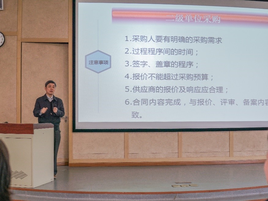 吴炎首先从校级和二级单位自行采购两种情况出发为大家详尽介绍了采购与招标流程,之后又在学校采招中心的网站上,为大家演示了大致的操作流程,让研一的新生们对采购招标的过程有了更清楚的了解。