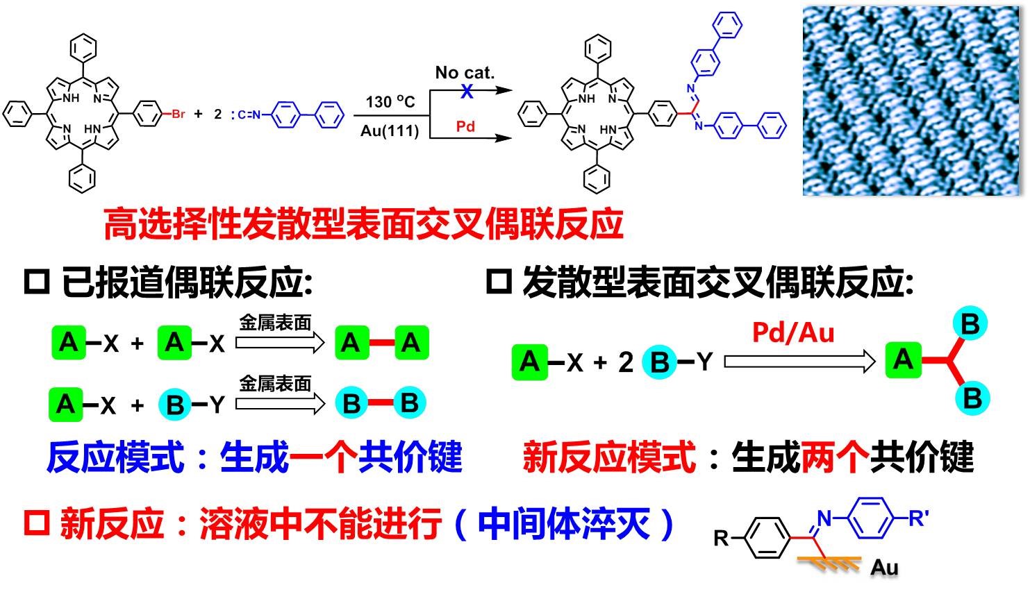 在本研究工作中,利用该课题组所发展的“外源性催化剂策略”,使用钯原子为催化剂,在Au(111)表面上实现了一分子芳基溴化物与两分子异氰的新型发散型交叉偶联反应(A+2B→A-2B型新反应模式,一步生成两个共价键),并具有很高的反应活性和选择性。需要强调的是,在溶液中,这芳基对一分子异腈加成所得的自由基中间体由于缺乏基底表面的吸附保护,容易与环境分子反应而淬灭。所以,这一反应在溶液中不能进行。