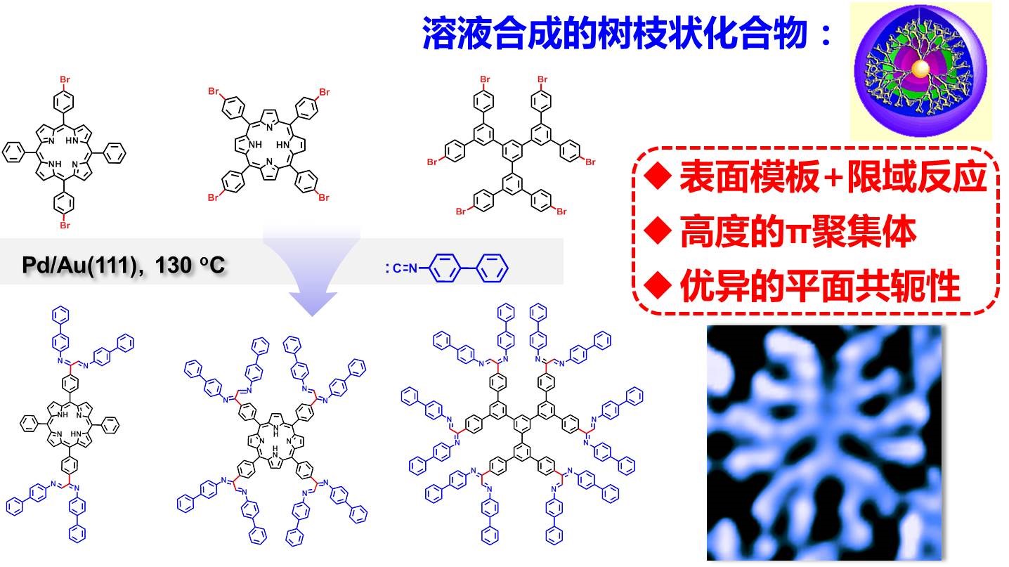基于所发展的表面发散交叉偶联反应,该课题组利用表面作为模板进行限域催化反应,首次实现了平面型树枝状大分子的合成,成功地制备了具有四个、八个和十二个异氰化物衍生分支的平面树枝状大分子(图2)。它们是一种超高程度的π聚集体,具有优异的平面共轭性。本研究工作所建立的平面共轭树枝状大分子的高选择性合成方法为其他各种平面树状大分子及相关共轭大分子系统的表面合成开辟了路径。