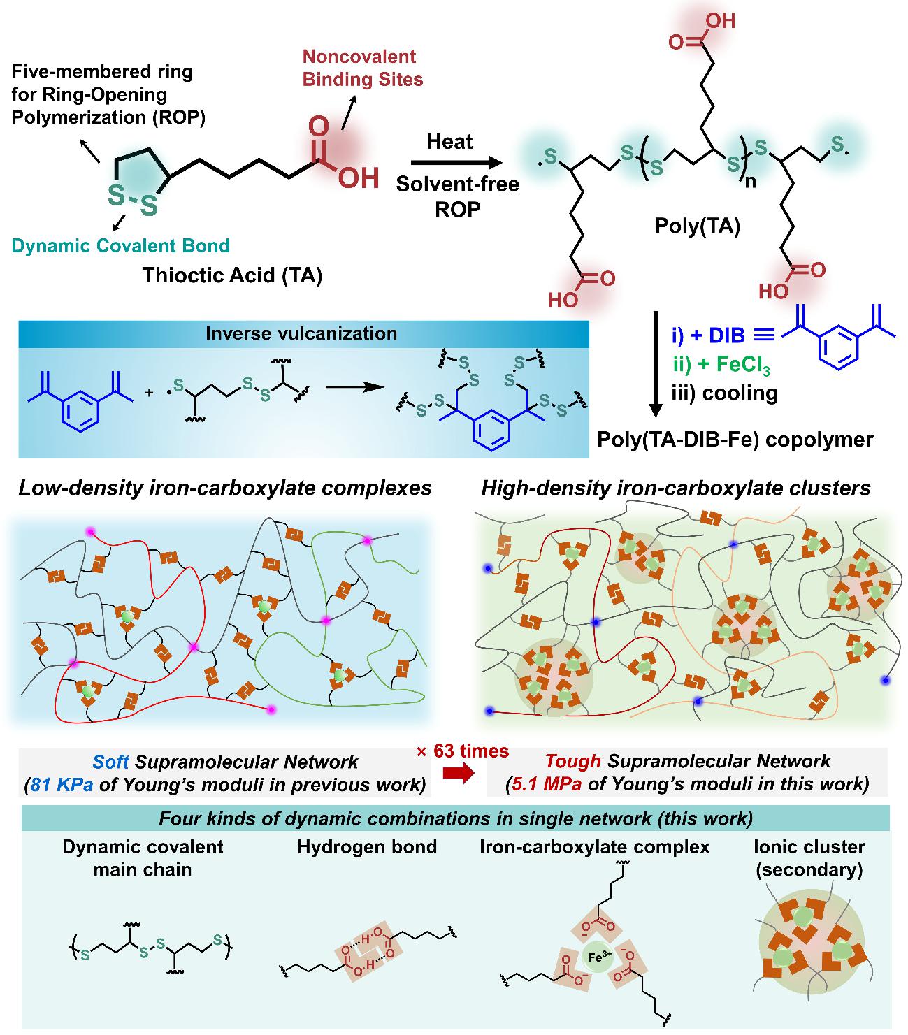 在前期工作中,该课题组开拓出一种全新的聚合方法能够将天然小分子硫辛酸一步转化成高性能聚合物材料(Sci. Adv. 2018, 4, eaat8192; JACS, 2019, 141, 12804)。虽然这种无溶剂聚合方法制备的聚合物材料展现了高延展率和快速自修复性能,但是它的机械模量较低(仅81KPa),这无疑限制了其在高性能材料领域的应用。同时,高强度的弹性体往往导致网络的低动态性,限制了其室温自修复性能。因此,如何设计出兼具高强度和室温自修复性能的弹性体材料是该类材料设计长期存在的挑战。研究人员发现,在原本体系和方法的基础上,将铁离子浓度提升至1%摩尔比,并且避免合成过程中从空气中引入的水分子,能够明显提升聚合物的机械模量(超过60倍),并且良好保持该网络的动态性,即展现出优异的机械延展性和室温自修复性能。通过X射线衍射、散射等技术证明,机械强度的大幅度提升源于高浓度铁-羧基复合物在聚硫辛酸独特的无溶剂聚合网络中通过强库仑力形成长程无序的离子簇,即在原本三种动态化学键的基础上进一步引入二级离子键交联作用。得到的聚合网络具有高杨氏模量(5.1 MPa),高机械延展性(超过6500%),室温自修复(可以在水下进行),可重复加工回收性等。该工作作为前期开创性工作的延伸,进一步推动了聚硫辛酸自修复聚合物的性能改善。该成果以“Toughening a Self-Healable Supramolecular Polymer by Ionic Cluster Enhanced Iron-Carboxylate Complexes”为题发表于Angew. Chem. Int. Ed.。