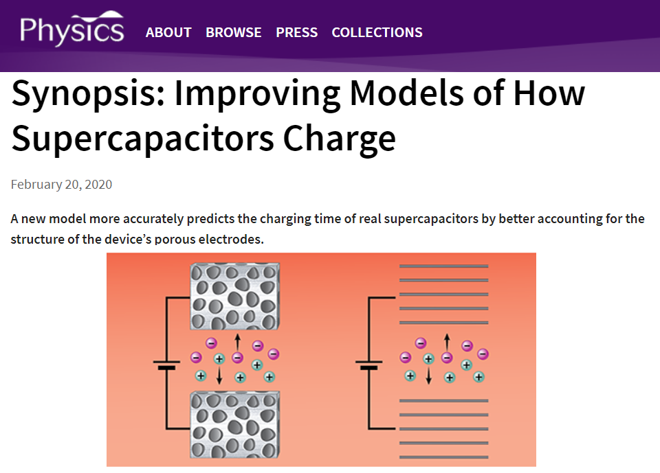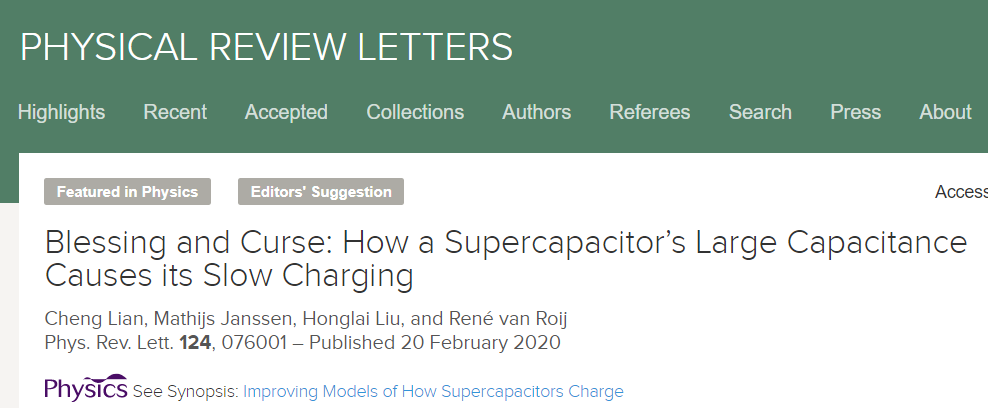 超级电容器是一种电能存储设备,碳电极中含有大量纳米级孔道,并被可移动离子流体所充满。当超级电容器冲放电时,这些可移动离子会根据其电荷性质靠近或远离碳孔道壁面。离子进出孔道及在孔道壁面附近重排所需的时间尺度决定了超级电容器的功率密度。然而,实验测量的充放电时间尺度与现有理论预测结果之间存在很大差距。华东理工刘洪来教授团队与荷兰乌特勒支大学理论物理研究所合作,提出了一种简单的多孔电极模型,该模型在可计算范围内重现了超级电容器充电过程中的显着特征。研究论文近日在Physical Review Letters(《物理评论快报》)上发表,并入选了Editors’ Suggestion,同时被Physics(《物理》)杂志作为同期亮点评述。