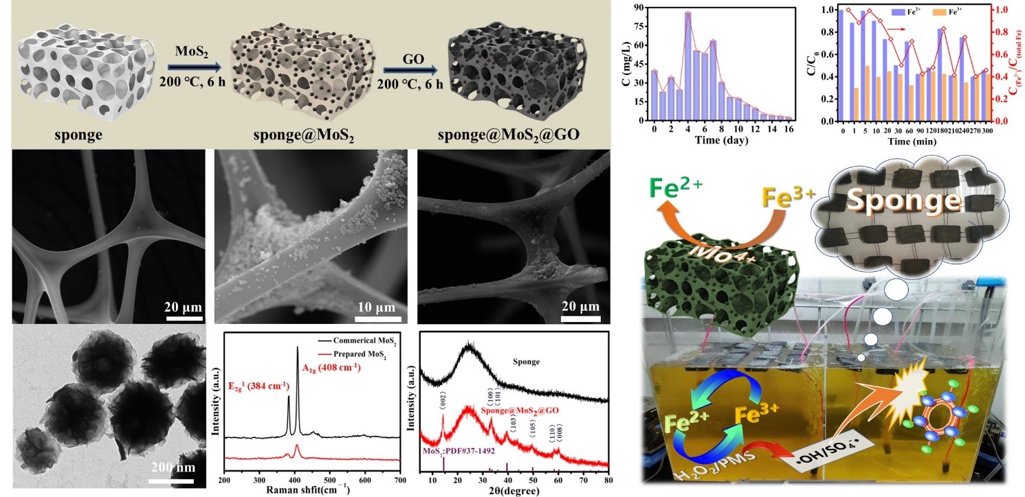 为了克服上述挑战,365英国上市集团官网邢明阳教授研究团队采用简单的浸渍-加热的化学方法,开发了三维硫化钼(3D-MoS2海绵)助催化(类)芬顿反应体系,实现了对染料类及抗生素类废水的高效处理。与传统芬顿体系及已报道的助催化(类)芬顿体系相比,其优势表现为:1)三维结构优化AOPs性能优势。以Fe3+/H2O2体系为例,3D-MoS2海绵的引入,可使其降解芳香族有机污染物的反应速率常数提高到原来的52倍;2) 助催化反应中心减少铁的用量,降低生成铁泥的风险。3D-MoS2海绵中纳米花片层堆积和不规则边缘可以提供更多的Mo4+活性位点,加速Fe3+/Fe2+的循环,抑制铁泥等二次污染物的形成;3) 运行成本低,实现大规模高效处理抗生素废水。3D-MoS2/Fe2+/PMS体系只需一次性加入铁离子(20 mg/L硫酸亚铁),即可实现连续高效处理140 L高浓度磺胺嘧啶废水(120 mg/L),其降解率可达97.87%,该体系可稳定运行16天以上。且其处理1吨废水的运行成本仅为0.33美元,使其具有巨大的工业应用价值。