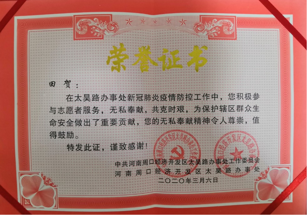 在疫情进一步发展的时候,作为入党积极分子的我自愿申请参加汝阳县马庄村的卡点志愿活动。我所负责的主要部分是对村民进行防疫知识的宣传,对非本村村民入村进行劝返,对本村人员出入村进行劝返、测体温、消毒以及登记等活动,对于外省务工回村人员进行详细的信息记录、隔离监督以及情况上报。在此次志愿活动期间,我感受到了全国人民团结一心,共抗疫情的力量,有很多乡间爱心人士、退伍老兵给我们卡点送去温暖物资,虽然病毒无情,但人与人之间有情。
