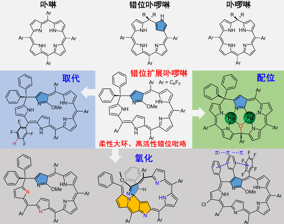 在前期研究中,解永树教授课题组对错位连接卟啰啉环外进行修饰,并通过环内、环外配位作用,成功调控其反应特性,由此合成了一系列新型结构,实现了较强的近红外吸收及阴离子识别特性(Angew. Chem. Int. Ed. 2020, 59, 1537)。在此基础上,为探索扩环对卟啰啉性质的调控,创新性地将一个错位吡咯嵌入正常卟啰啉大环,得到了错位扩展卟啰啉。该扩展卟啰啉的第一氧化电位很低,易于氧化。有趣的是,利用不同氧化条件可简便地得到局部氧化、多重骈环以及芳基迁移型等系列新颖扩展卟啰啉。此外,由于扩展卟啰啉大环具有较好的柔性,可以与两个Pd(II) 配位。在配位过程中,一个中位sp2-C会发生氧化形成羟基取代的sp3-C,所形成的羟基以脱质子的形式桥联两个Pd(II)。错位扩展卟啰啉及其转化产物均表现出丰富的氧化还原以及近红外吸收特性。上述合成策略巧妙利用了大环柔性与错位吡咯单元的独特活性,为进一步设计、合成结构新颖、性能优异的异卟啉化合物提供了新思路。