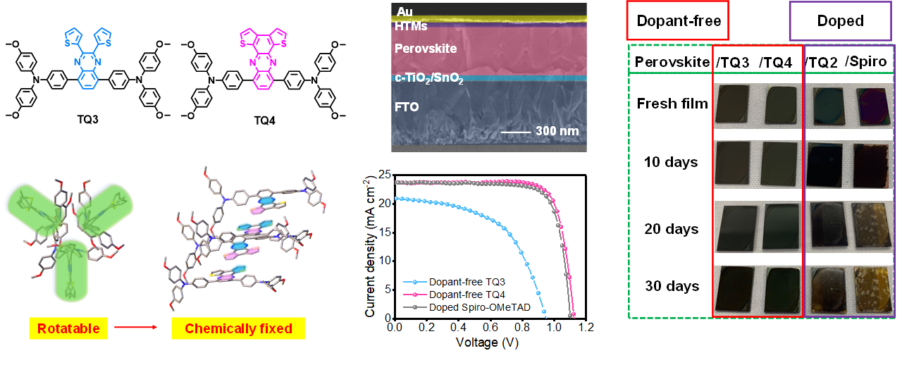 最近,他们通过在喹喔啉吡嗪环上合理的拓展共轭结构提出一种共平面π延伸策略,该策略能够有效调控HTM的分子堆积与分子间相互作用,实现了较高的薄膜空穴迁移率并成功制备了高性能非掺杂钙钛矿太阳电池。