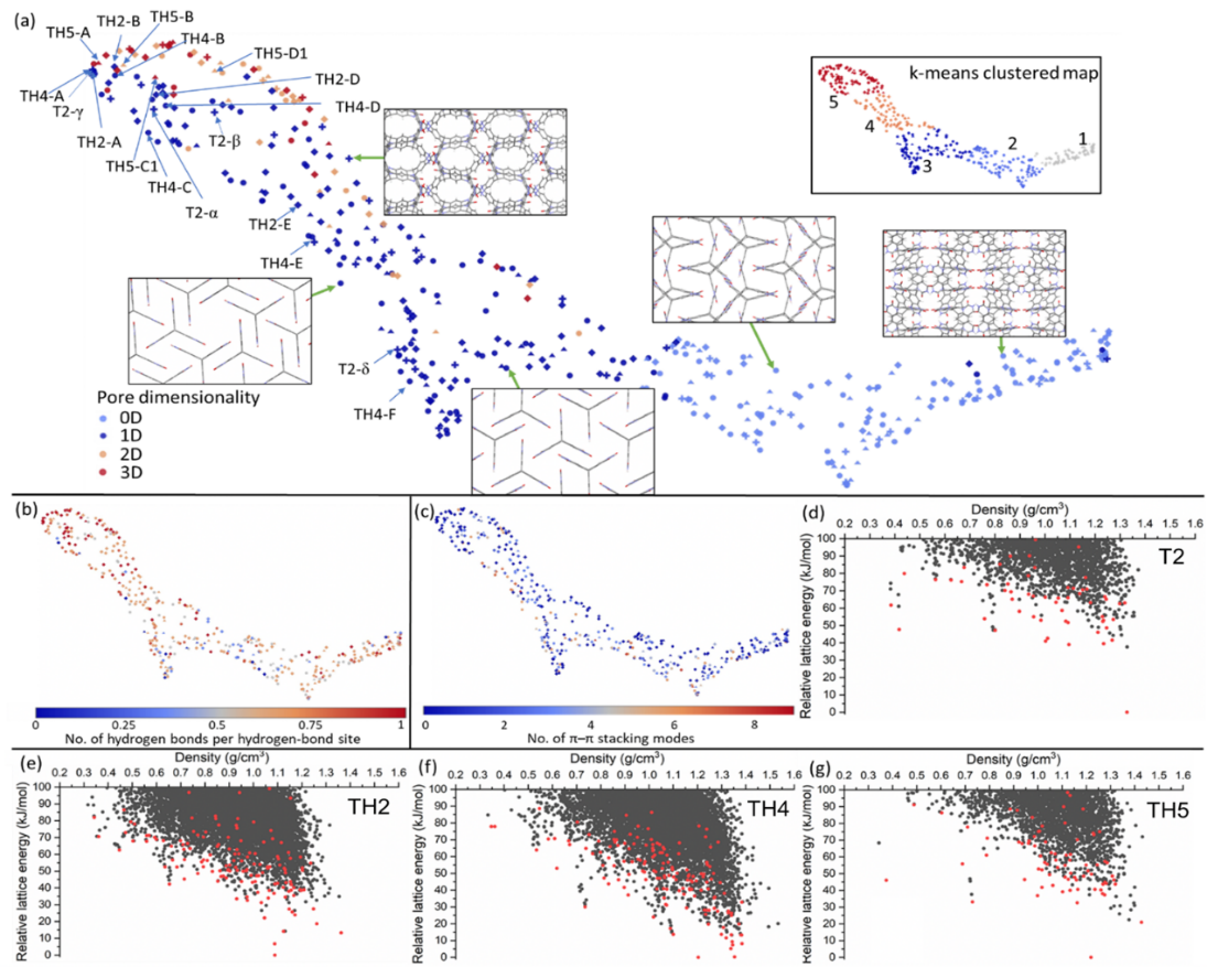 物理性能优异的分子晶体材料可以应用在如气体储存与分离等诸多领域,然而分子晶体领域的设计更多依赖于经验。在前期关于绘制能量-结构-性能图进行晶体结构预测(Nature, 2017, 543, 657)的研究基础上,针对传统晶体预测结果给出数以万计的可能结构致使三者关系难以解读,以及所预测结果无法跨分子进行比较的问题,团队研发人员在本工作中进一步延伸拓展了上述方法。以氢键有机框架结构为例,新方法首先对一系列的能量-结构-性能图进行了更加详尽的刨析,找出最有潜力的分子及类型并分析原因,在此基础上结合机器学习的方法,对ESF图中的高维数据进行了无监督学习型分类与降维可视化。这种更加通用、便捷的工作流程可以系统性的从高维数据中直接筛选出代表性结构,从而使研究人员可以直接在极其复杂的ESF图上进行导航搜索,发现能量有利或性能优异的分子晶体结构,同时可视化的预测、揭示复杂的结构-性能相关性。本研究同时开发了一种开源的交互式可视化工具,为检索与分析晶体结构提供了有力保障。结合以上探索,团队研发人员在研究中成功预测了一种超低物理密度的分子晶体。该工作为计算机探索、研发功能性分子晶体材料提供了新的方法和新方向,同时为推进该领域未来的全自动化提供了新的思路。