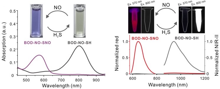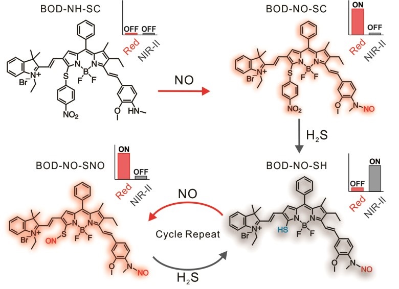研究人员利用分子工程,在近红外荧光团BODIPY类染料上,分别引入H2S、NO的特异性响应的功能团,构建了双激活响应的荧光探针BOD-NH-SC。该探针几乎没有初始荧光,可先后与NO、H2S反应分别生成具有红色荧光的BOD-NO-SC和具有NIR-II荧光的BOD-NO-SH。而BOD-NO-SH亦能与NO反应得到同样具有红色荧光的BOD-NO-SNO,并可再次被H2S转变生成BOD-NO-SH。正是基于BOD-NO-SNO和BOD-NO-SH之间快速的、可重复循环的S-亚硝基化和去亚硝基化作用,实时在线实现了两种信号分子交互关系的可视化研究。