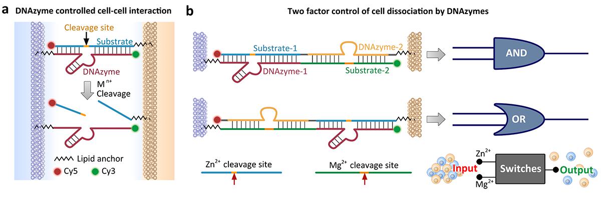 通过细胞表面修饰诱导细胞间相互识别并进一步调控细胞行为,一直是近年来生命科学领域的研究热点。通过基因工程进行细胞表面修饰已经得到了广泛研究,但该方法操作复杂,且易受到细胞内复杂环境的干扰。因此,本工作设计了一种基于DNAzyme控制细胞间相互作用的细胞表面工程策略,在DNAzyme及其底物的5'端修饰胆固醇分子,并通过疏水作用自发插入到活细胞表面磷脂层中; 3'端采用荧光标记,可对细胞行为进行实时荧光成像跟踪。将DNAzyme及其底物分别修饰在两组细胞表面,通过DNAzyme与底物杂交,可实现细胞-细胞快速组装。进一步,加入特定的金属离子可切断底物,诱发细胞组装体的可控解离。为了更精细地调控细胞动态聚集-解离,本工作利用Zn2+和Mg2+特异性DNAzyme链和相应底物构建了DNA双链分子开关,实现了包括AND和OR运算在内的双离子细胞解离调控,通过双链杂交形成细胞组装体,基于Zn2+和Mg2+两种离子控制运算输出。