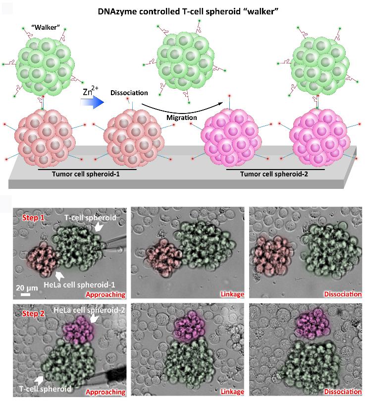 此外,利用建立的DNAzyme策略还可以实现多细胞球之间的相互作用,可操控T细胞球在不同肿瘤细胞球之间的迁移,为未来肿瘤治疗方面的应用开辟了新途径。