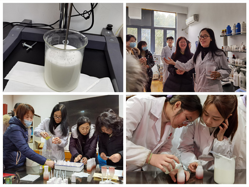 在水乳制作现场,经原料称量、水油相混合、均质、降温、功效成分添加、分装等一系列操作后,一瓶瓶“华理神仙水”“华理小黑瓶”便制作完成。大家纷纷现场试用、感受。据尚亚卓介绍,制作的水乳中含有依克多因及多种植物提取功效成分,具有活肤、抗衰、美白、保湿、抗炎以及修护等功效。