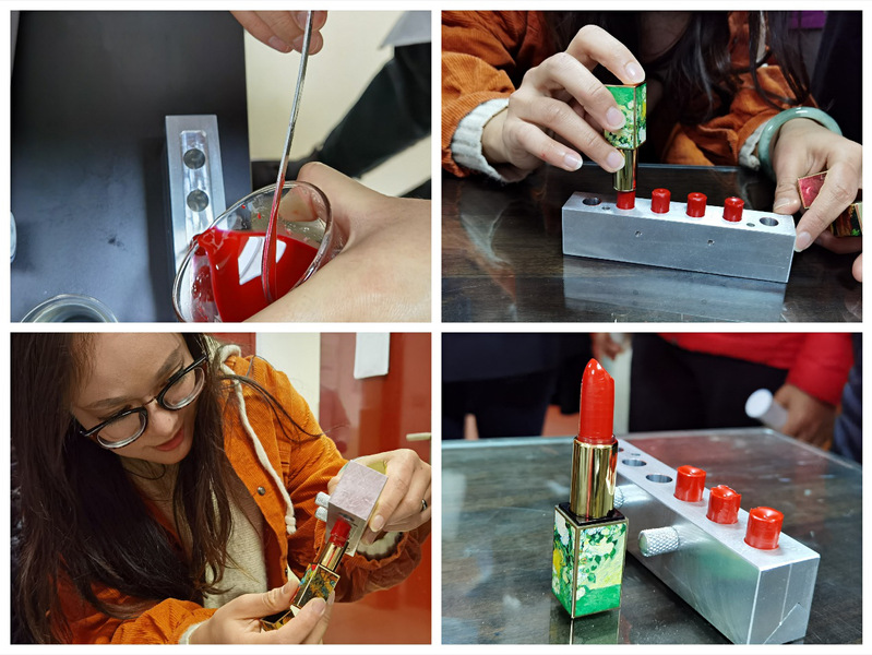 而在另一实验室,手工口红的制作正在有条不紊地进行:称量、搅拌、加热、装模、冷冻、脱模。经过一系列精细操作后,第一支手工专属口红便诞生啦!老师们迫不及待地进行口红试色,爱不释手。