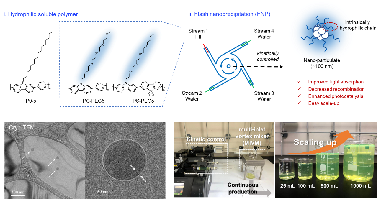 近日,该团队首次引入FNP制备有机纳米光催化剂,通过分子工程发展亲水性可溶共轭聚合物,利用FNP方法获得了分散均匀、性状稳定的有机纳米光催化剂水溶液。该策略制备的有机纳米光催化剂的光催化活性显著提高了70倍,在全光谱光照射下达到37.2 mmol h-1 g-1的峰值析氢速率,是目前聚合物光催化剂的最佳结果之一。