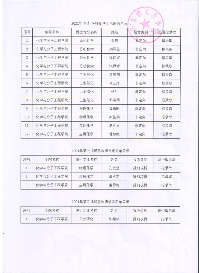 化学与分子工程学院2021年博士录取名单公示