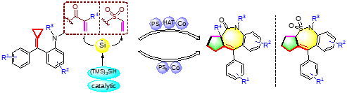 在过去的研究工作中,通常需要使用化学计量的硅烷来构建含氮杂环化合物,这不符合当前合成化学中的绿色、原子和步骤经济性的新理念。在该研究工作中,我们引入可见光和金属钴协同催化的方法,首次将反应体系中硅烷的用量降低为催化量,实现了多并杂环化合物的高效合成。该反应中硅烷经由光催化循环生成硅基自由基,随后选择性加成到底物中的烯烃上并诱导亚烷基环丙烷(ACPs)发生分子内的碳环化反应,生成了最终环化产物和硅自由基,该自由基中间体再经钴催化过程重新生成硅烷完成整个催化循环。
