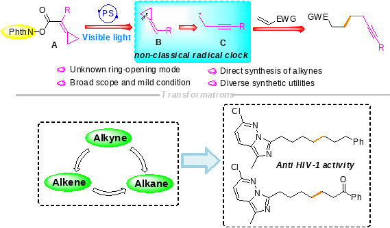 小环张力分子中的亚烷基环丙烷化合物的环张力和碳碳双键赋予了亚烷基环丙烷化合物(ACPs)丰富的反应性能。它们可以在过渡金属、路易斯或布朗斯特酸的促进下,加热或自由基引发剂的作用下发生各种类型的环化反应生成一系列结构较为复杂的化合物。近年来,这些方面的研究已经较为成熟,但是却一直没有突破亚烷基环丙烷(ACPs)现有的反应模式。最近,我们首次设计并合成了含有亚烷基环丙烷的邻苯二甲酰亚胺酯A,其在可见光催化体系下可以生成环丙基次甲基自由基中间体B,随后发生分子内的非经典自由基钟重排过程得到高炔丙基自由基中间体C,该亲核性自由基中间体可以与贫电子烯烃发生加成反应,最终生成各种类型的炔烃类化合物。