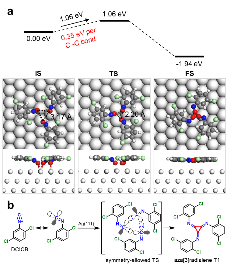 在确定了[1+1+1]环加成反应产物的几何结构和立体构型基础上,进一步通过密度泛函理论(DFT)计算模拟了两种可能的反应路径,即通过协同或逐步反应形成三个C–C键。两个反应路径的初态均是前体分子DCICB通过分子间弱相互作用组装形成的同手性三聚体,其平面吸附构象和同向构型促进了异氰基末端碳的HOMO和LUMO之间的相互作用,有利于形成前线轨道理论中对称性允许的过渡态。对于协同反应路径,DFT计算显示形成三个C–C键的能垒为1.06 eV,平均形成一个C–C键的能垒为0.35 eV(图3)。对于逐步反应路径,逐个形成C–C键的最高能垒是0.45 e V,而同时形成两个C–C键的能垒是0.79 eV,平均形成一个C–C键的能垒为0.39 eV。此外,[1+1+1]环加成反应是一个放热的过程,总能量降低约2 eV。考虑到形成每个C–C键的能垒都很低,因此在室温的反应条件下两种反应路径都是可行的。