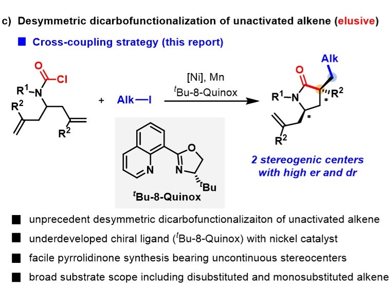 去对称化反应是指含有前手性中心或内消旋化合物在其中一个反应位点选择性官能团化的同时实现对映面识别的过程,是一类合成手性小分子的重要策略。烯烃的不对称转化一直是有机化学研究的核心内容之一。在烯烃的众多反应模式中,去对称化反应是其中一类十分重要的转化方式。目前烯烃的去对称化反应研究进展主要集中于RCM反应或氢官能团化反应。烯烃的去对称化双碳官能团化反应可以在烯烃的两端都引入含碳官能团的同时,构建多个手性中心,能够迅速地增加分子的复杂性,是一类具有吸引力反应模式。