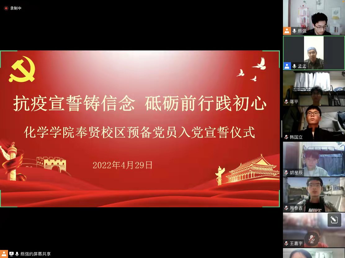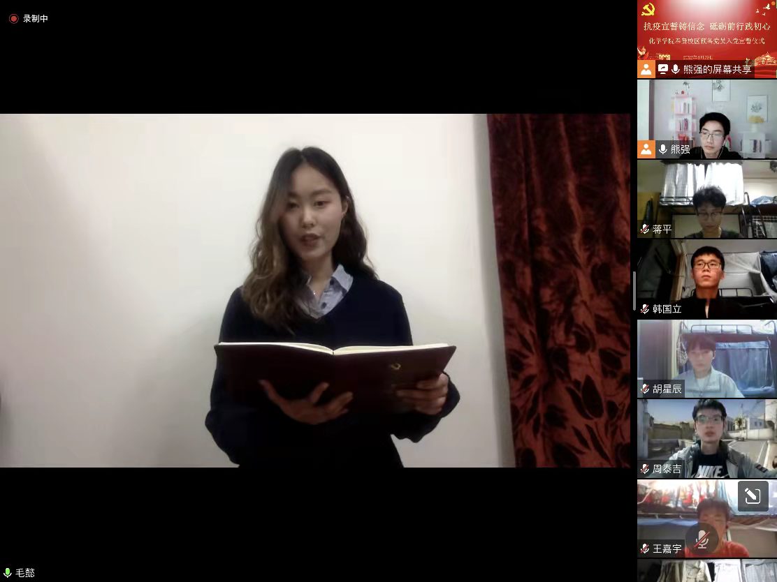 为切实增强学生党员在疫情防控中的责任感和使命感,鼓舞新老党员继承和发扬党的光荣传统和优良作风,4月29日晚上,化学学院党委举办了一场主题为“抗疫宣誓铸信念,砥砺前行践初心”的线上入党宣誓仪式。学院党委副书记孟庆鹏、本科生奉贤党支部书记聂婷、研究生辅导员熊强以及本科生预备党员、研究生预备党员、研究生正式党员代表、入党积极分子代表等60余名学生参加了仪式。