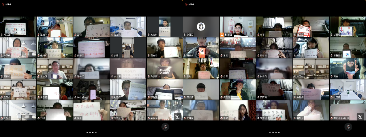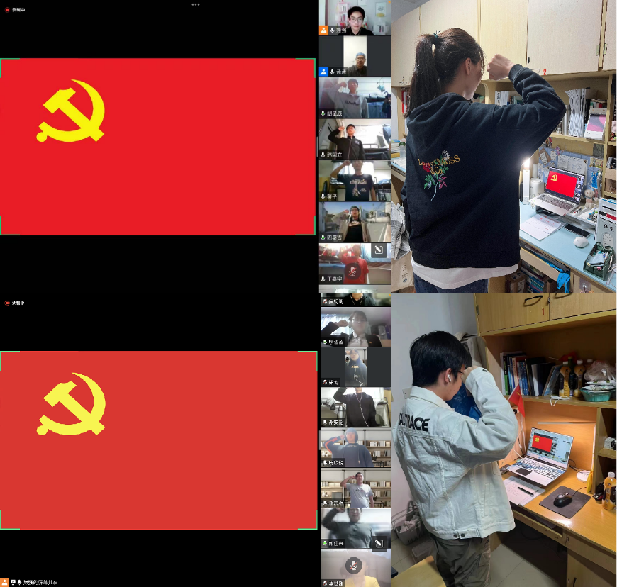 随后,本科生预备党员刘强、李志强代表新党员表达了对党组织悉心栽培以及老党员热切关怀的感谢,并表示将严格以党员标准要求自己,坚定理想信念。研究生正式党员代表刘敬旭以自身在疫情期间的实际行动鼓励新党员们要充分发挥党员先锋模范作用,积极参与到抗疫中去。入党积极分子代表帅欣悦表示,自己既感受到了宣誓的庄严,也从党员们在疫情期间的实际行动中受到了鼓舞,希望自己能够早日加入中国共产党。孟庆鹏对新党员的加入表示祝贺,对老党员能够发挥先锋模范作用进行了赞扬,对入党积极分子的入党热情表示了鼓励,希望大家不仅要牢记入党誓词,更要践行入党誓词,尤其是在抗疫的艰难时刻,更应该为同学们做出表率。接着,研究生预备党员毛懿深情地朗诵了“守望相助,共克时艰”,让同学们进一步体会到身为共产党员在这个特殊时期的责任与使命。最后,大家纷纷以文字、图片等方式表达对抗疫终将取得胜利的祝福和信心。