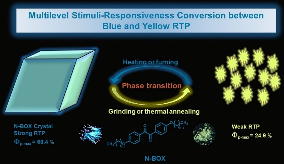 外界刺激下N-BOX由于相转变在高效的蓝色RTP与黄色RTP之间的可逆变化示意图