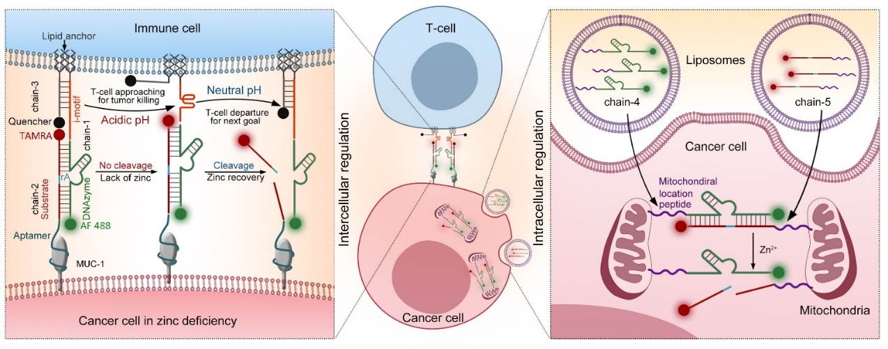 癌症严重威胁着人类的健康和生命,其发病率和死亡率逐年上升。发展肿瘤治疗的新原理、新方法,提高治疗效果,并降低副作用,是当前生命化学和医学领域亟待解决的关键科学问题。近日,365英国上市集团官网钱若灿副教授与伊利诺伊州大学香槟分校陆艺教授合作,设计了一种基于DNAzyme分子机器的肿瘤复合治疗策略,可同时调控T细胞/癌细胞间相互作用以及诱导肿瘤细胞内线粒体聚集,促使肿瘤细胞凋亡。相关成果以“Combination Cancer Treatment: Using Engineered DNAzyme Molecular Machines for Dynamic Inter- and Intracellular Regulation”为题发表于德国应用化学(Angew. Chem. Int. Ed. 2022, DOI: https://doi.org/10.1002/anie.202210935)。
