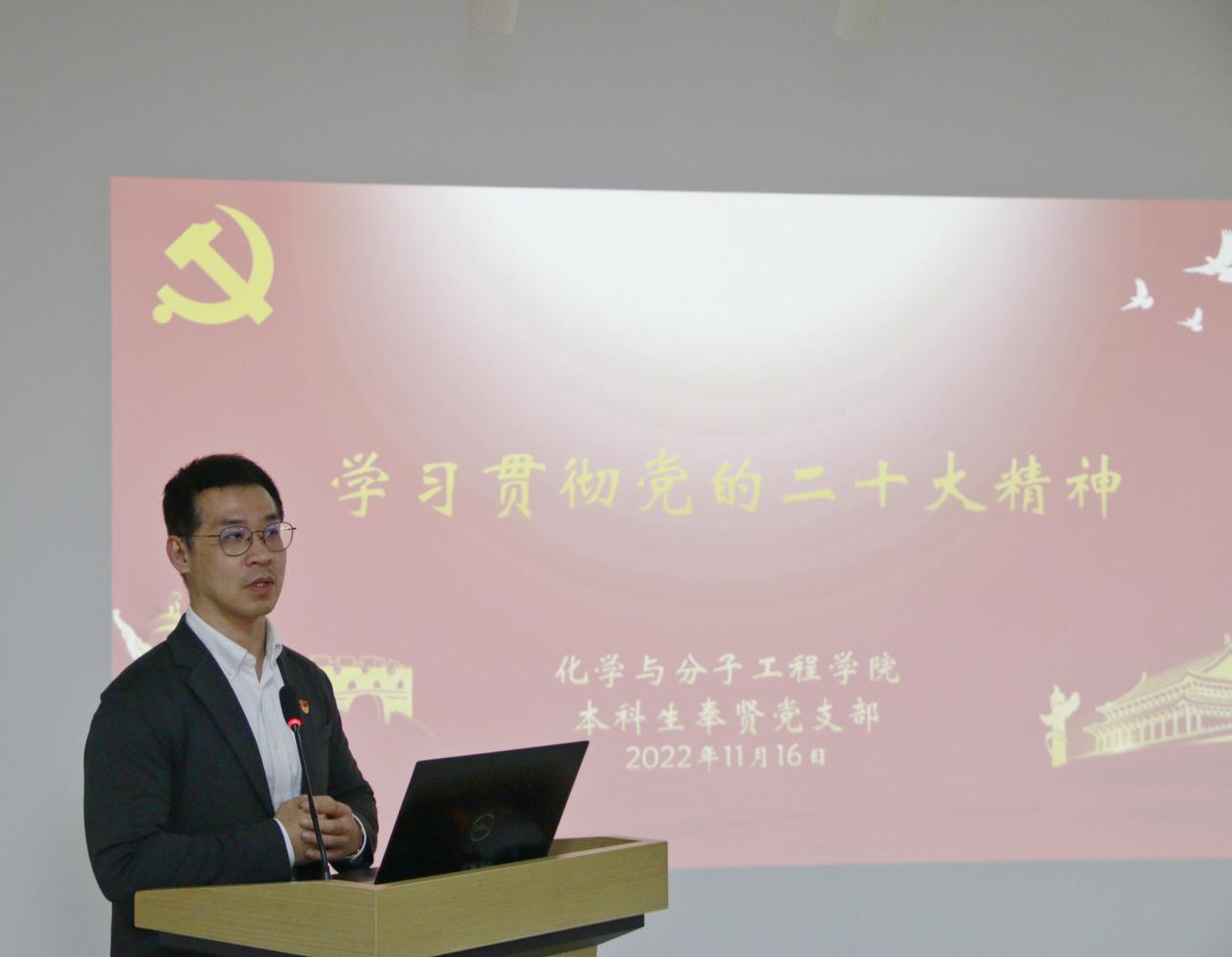 【学院党委带头讲1116中午,化学与分子工程学院本科生奉贤党支部奉贤校区学生动中心319组织全体党员学习宣传贯彻党的二十大精神,学院党委副书记孟庆鹏担任专题党课的主讲人学院2020级辅导员聂婷主持会议,支部全体师生党员和优秀学生代表参加学习