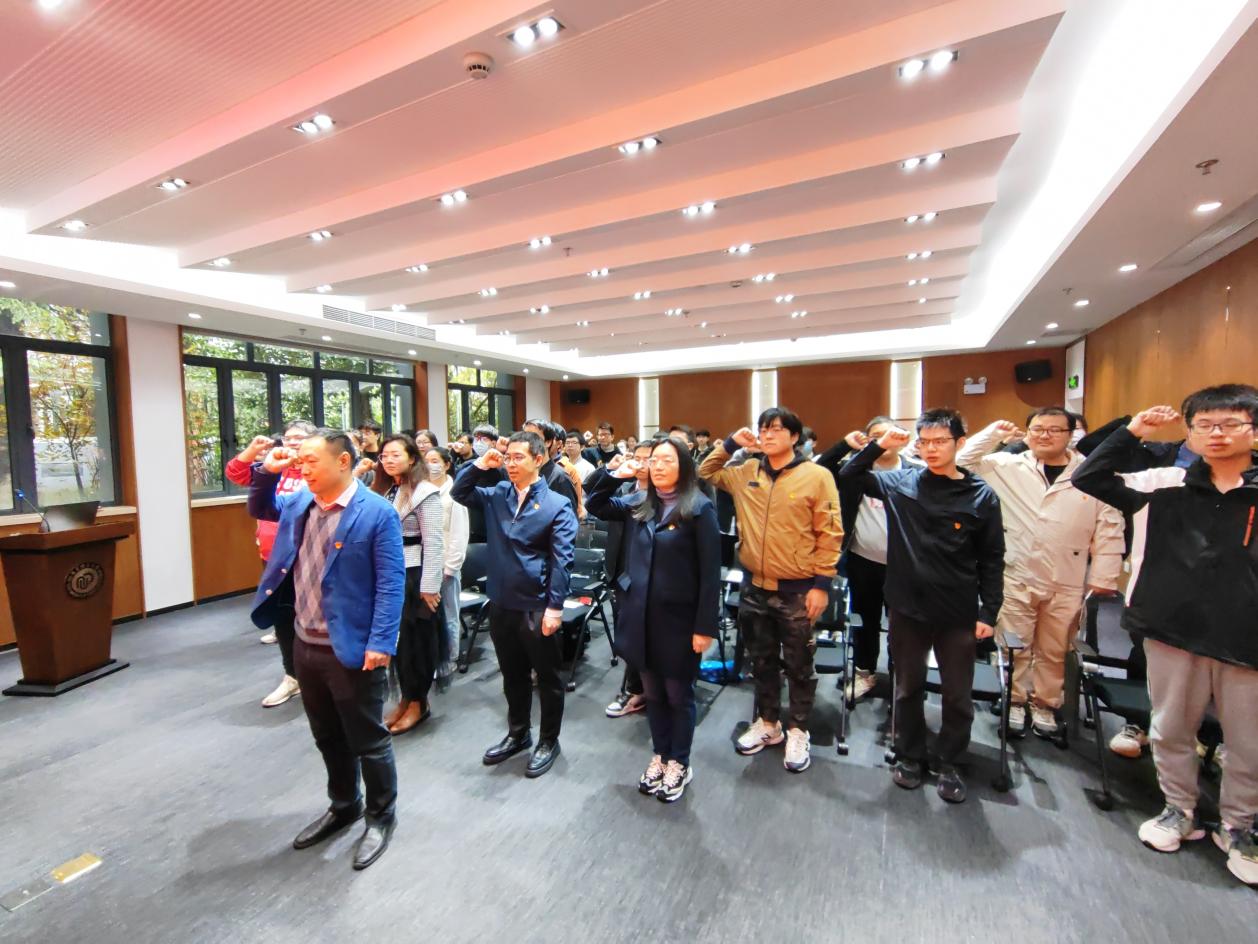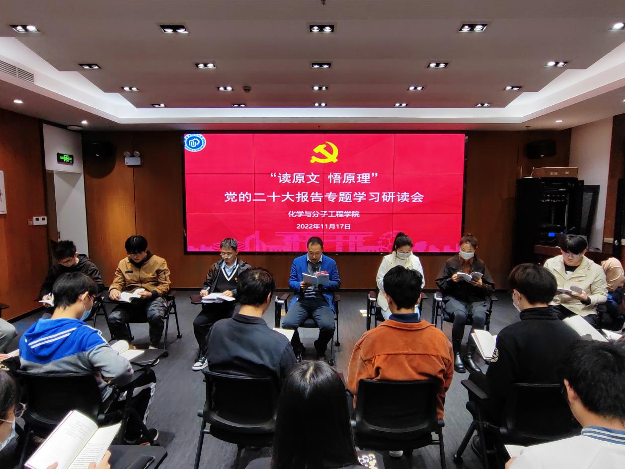 2022年11月17日,化学与分子工程学院精细化工研究生第一党支部与本科生徐汇党支部在费林加诺贝尔奖科学家联合研究中心联合举办了“新党员宣誓老党员重温入党誓词”活动暨“读原文 悟原理”党的二十大报告学习研读会。化学学院院长曲大辉,党委副书记孟庆鹏及支部全体成员参加活动。本次活动由孟庆鹏主持。