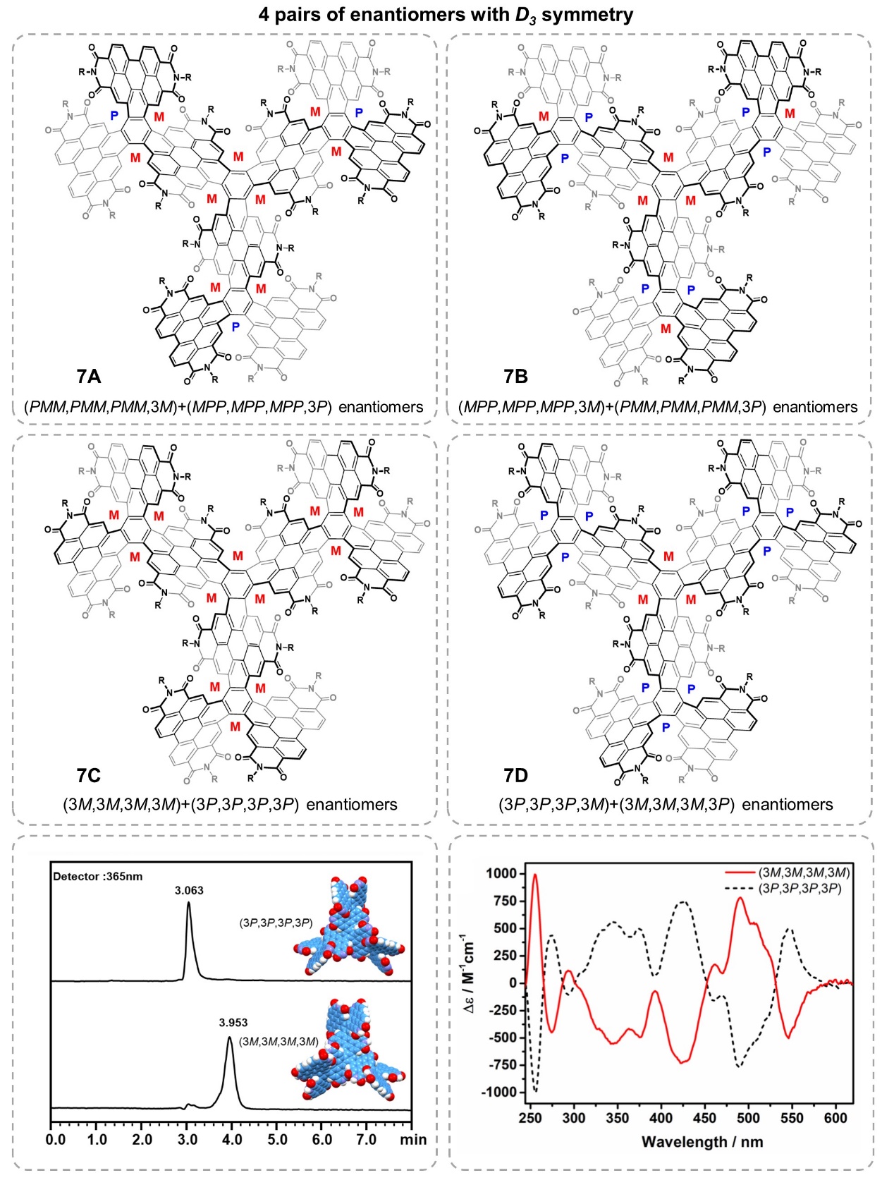 虽然有些遗憾我们未能得到能够解析的晶体数据,但化合物7的一维核磁证实该分子具有D3对称性, 基于四手性中心12重[5]螺烯的结构特点,化合物7理论上存在256种可能的立体异构体,但具有D3对称性的分子只有如图所示的4对对映异构体:7A,7B, 7C和7D。化合物7的二维核磁明确归属了芳香氢的空间位置,结合理论二维核磁计算和补充实验,我们最终确定化合物7具有7C的立体构型,并随后对7C的对映体进行了手性拆分和手性光谱方面的研究。