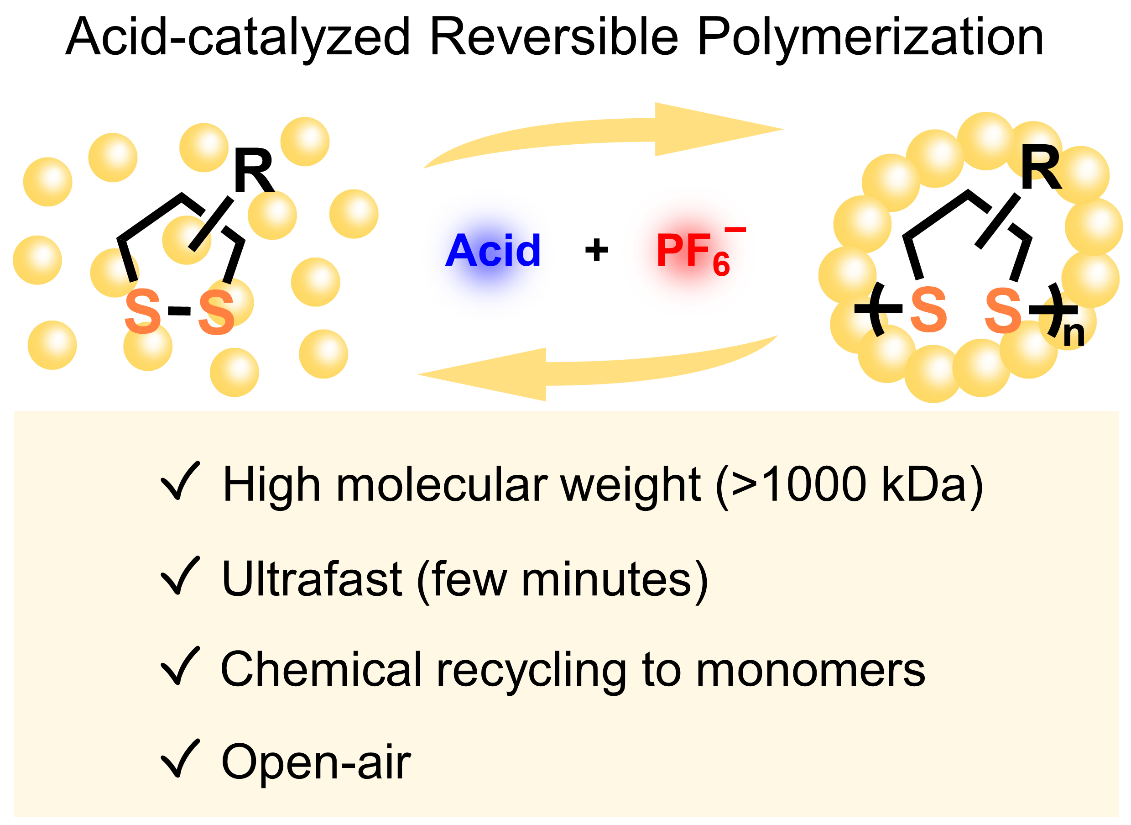 近年来,基于二硫五元环小分子的开环聚合反应得到了广泛的研究,目前已报道的聚合方法主要有氧化法、光/热引发以及硫醇盐引发等,其中氧化法和光/热引发法的聚合过程往往难以实现精准控制,碱性环境下硫醇盐引发的阴离子活性聚合目前研究的最为广泛及可控,但是需要严格无水无氧环境及不适用于酸性单体等局限性限制了其在化学可回收材料等方面的实际应用。基于对硫辛酸类化合物的长期兴趣(J. Am. Chem. Soc. 2022, 144, 2022-2033),研究人员在实验过程中发现酸和非配位离子(如PF6-)能够显著促进硫辛酸类衍生物的聚合反应,这一聚合过程反应速度快、转化率高、分子量大,并且能够在空气中直接进行。研究人员提出了经由硫鎓离子的阳离子聚合机理,非配位阴离子助催化剂的存在能够使硫鎓离子中间体处于稳态并显著提升反应转化率。这一酸催化体系同样能够催化聚合物的解聚过程,通过酸催化制备的宏量聚二硫材料能够在酸催化下再次解聚,实现了对高分子量聚二硫材料的闭环回收。这一通过酸催化的聚二硫材料的可逆聚合/解聚反应,为在温和条件下实现环状二硫单体的高分子量、快速聚合及其聚合物的高效解聚回收提供了全新策略。