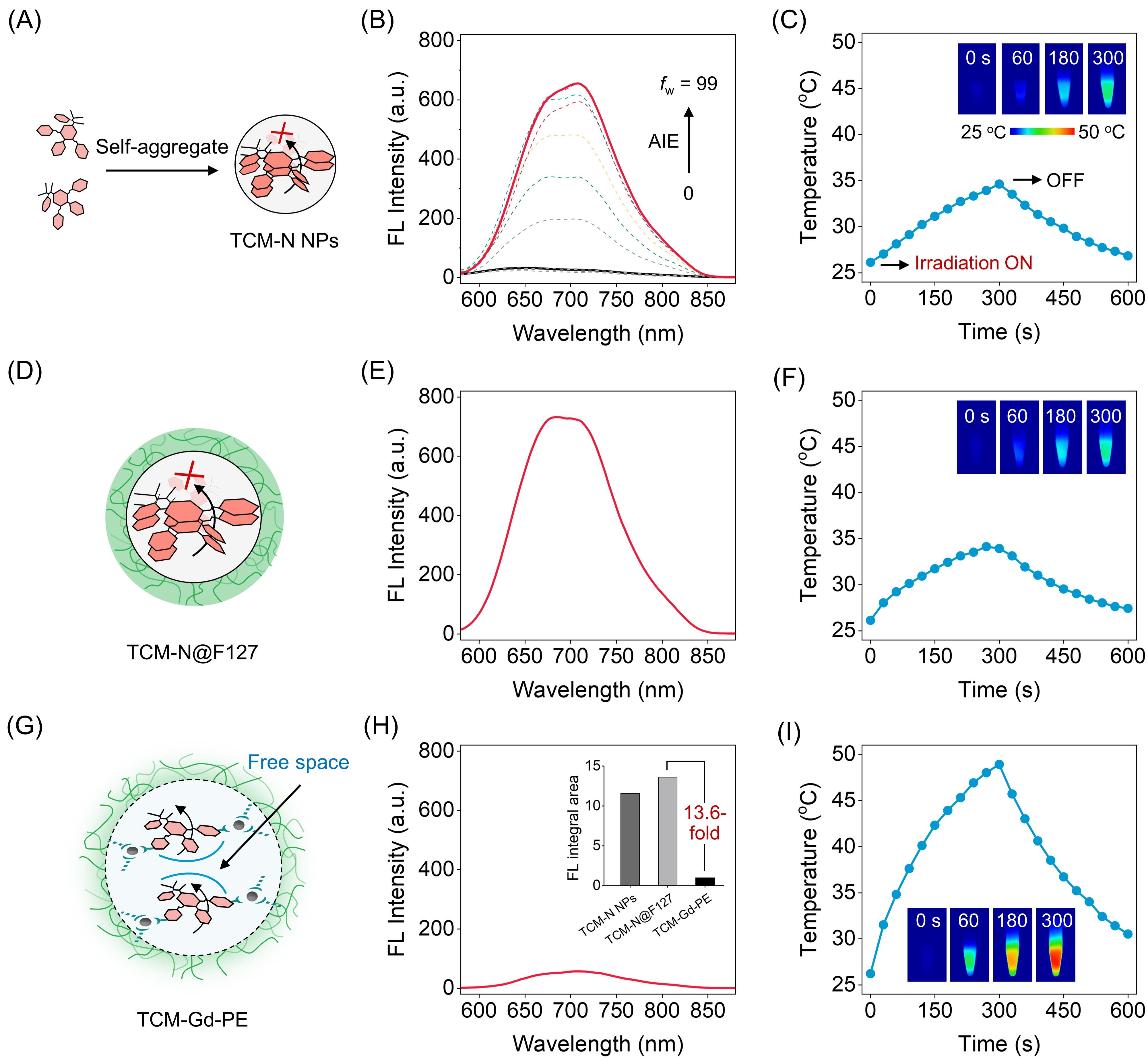 在纳米诊疗体系中,如何基于限域环境精准调控分子运动和相互作用仍面临着极大的挑战。例如,以疏水作用力驱动的组装方式是构筑纳米体系最为广泛的手段(如疏水性分子的自组装、双亲性的嵌段共聚物包裹)。然而,该种策略会使得纳米体系产生“疏水的墙”和“致密的核”,从而导致难以在其内部操纵分子行为。近年来,将光热治疗(PTT)与磁共振成像(MRI)集成在纳米诊疗体系中,对实现个性化诊疗具有重要临床应用价值。值得注意的是,现有纳米体系的限域环境严重抑制了具有光热性能染料的激发态分子内运动,进而极大地限制了其光热性能;此外,“疏水的墙”会阻碍其与水质子间的相互作用,显著地降低产生MRI信号的强度。因此,如何从分子设计策略出发,构建兼具高性能PTT和MRI功能的纳米诊疗体系具有重要的研究意义,亦面临着重大的挑战。