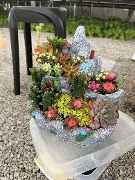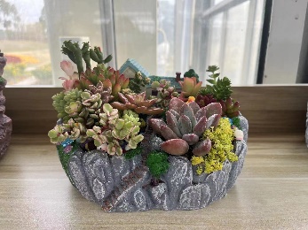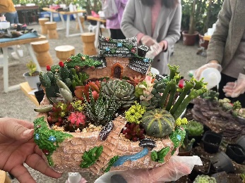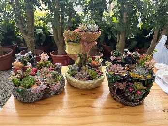 在老师的指导下,大家纷纷开始动起手来,细心配置专用的种植土,挑选心仪的多肉,小心翼翼地填土、搭配、固定,最后再铺上装饰石。一盆盆精美的多肉小盆栽就完工了,大家纷纷展示自己的小作品。