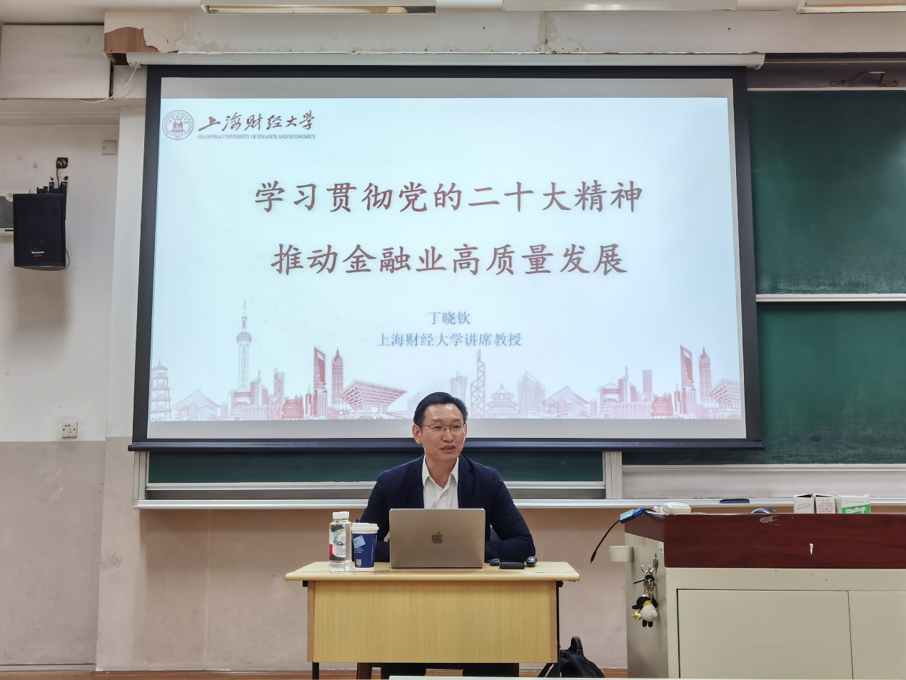 丁晓钦教授围绕“建设现代化产业体系需要金融的服务与支持、完善支持绿色发展的金融政策和标准体系、完善分配制度,增加城乡居民财产性收入、健全社会保障体系,完善养老医疗保险制度、深化金融体制改革,加强和完善现代金融监管、提高金融全球竞争能力,扩大高水平双向开放、正确把握金融本质,坚持社会主义发展方向”等七个方面,着重讲解了党的二十大报告中关于实体经济的重要论述,以及金融服务于实体经济、服务于我国经济发展的战略要求和金融发展的根本性目标和定位等内容,并强调我们要始终不渝以习近平新时代中国特色社会主义思想为指导,坚定不移走中国特色金融发展之路,把党的二十大作出的重大决策部署付诸行动、见之于成效,奋力书写金融服务中国式现代化新篇章。