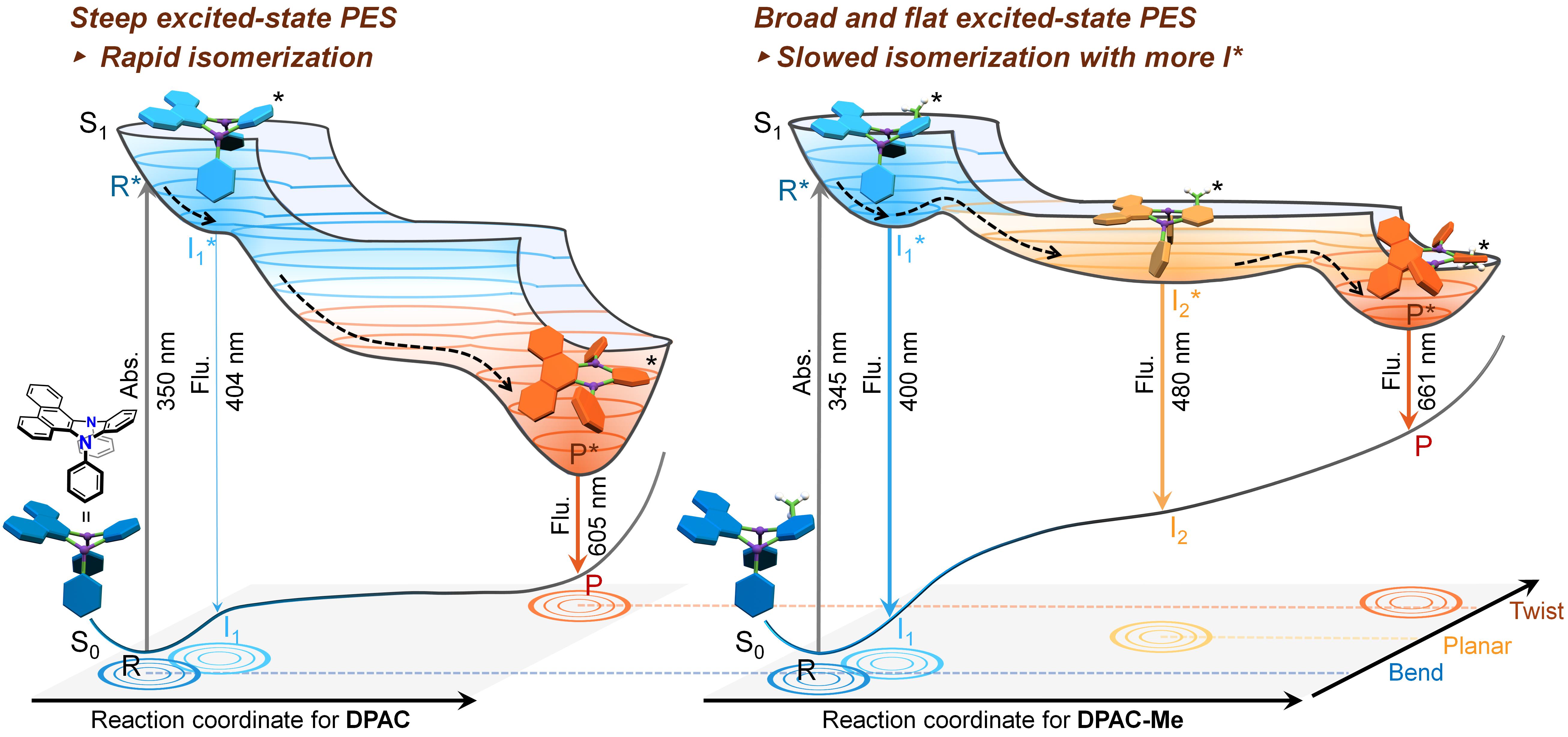 进一步结合飞秒瞬态吸收光谱和含时密度泛函理论计算,作者发现位阻效应对激发态势能面形状和激发态动力学过程产生了显著的影响。DPAC分子因其对称的几何构型和较弱的分子内位阻效应,激发态弯曲到扭曲的结构演变非常迅速,从而主要辐射出大Stokes位移的红光发射;与DPAC陡峭的激发态势能面相比,增强的位阻效应使得单取代DPAC的激发态结构演化路径变得更宽、演化速度变得更慢,同时诱发产生了新的中间态,进而表现出宽光谱的三波段发射;更强的位阻效应使得双取代DPAC的激发态结构演化受限,表现出正常Stokes位移的蓝光发射。值得指出的是,在该工作首次证明了单一稠环共轭骨架在激发态可以发生从弯曲到平面再到扭曲的多步逐级结构演变,并且这三种构象可以作为发射态产生本征的多重荧光发射。该工作进一步丰富和完善了振动诱导发光机制。